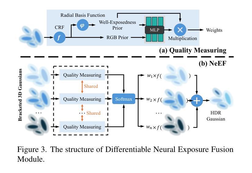 - 引入可微神经曝光融合(NeEF)技术,将基础与估计的三维高斯融合为HDR高斯。