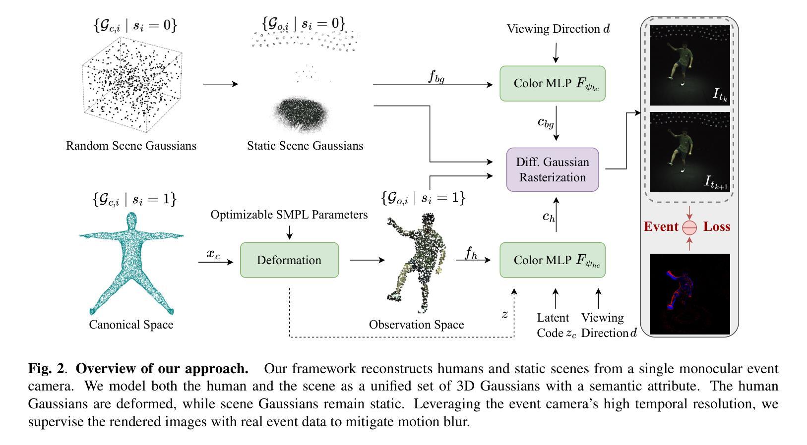 - 提出一种新颖的事件引导的人类场景重建框架,通过单一事件相机对人和场景进行建模。
