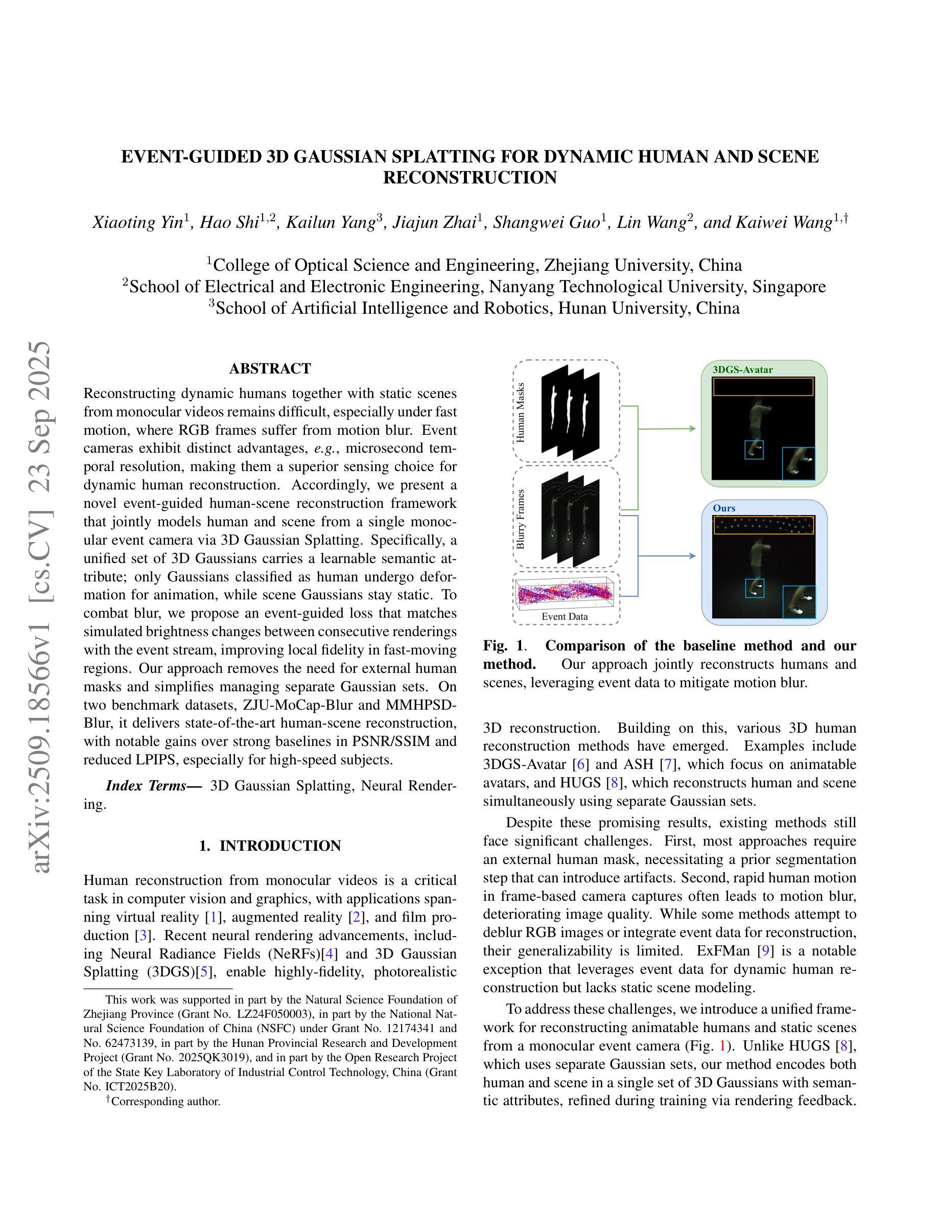 从单目视频中重建动态人体和静态场景仍然具有一定的挑战性,特别是在快速运动情况下,RGB帧会受到运动模糊的影响。事件相机具有独特的优势,例如微秒级的时序分辨率,使其成为动态人体重建的出色感知选择。因此,我们提出了一种新型的事件引导人体-场景重建框架,该框架通过3D高斯喷涂技术,利用单个单目事件相机对人体和场景进行联合建模。具体来说,一组统一的3D高斯携带可学习的语义属性;只有被分类为人类的高斯才会发生变形以实现动画效果,而场景高斯保持不变。为了对抗模糊,我们提出了一种事件引导损失,该损失匹配连续渲染之间的模拟亮度变化与事件流,提高了快速移动区域的局部保真度。我们的方法消除了对外部人体掩膜的需求,并简化了单独管理高斯集的过程。在ZJU-MoCap-Blur和MMHPSD-Blur两个基准数据集上,它实现了最先进的人体-场景重建,在PSNR/SSIM上有显著的收益,并且降低了LPIPS,特别是在高速主题上表现尤为出色。