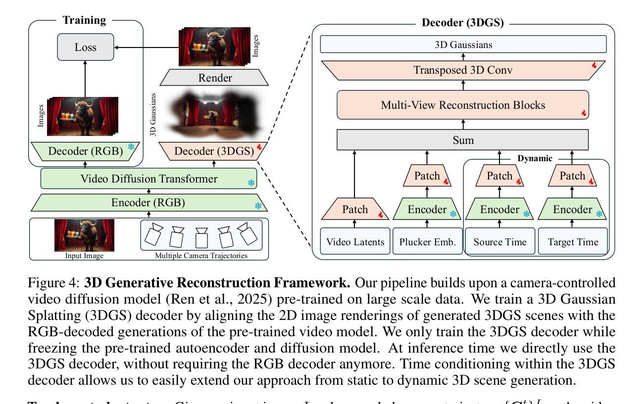 - 采用预训练的视频VAE和范围视图适配器进行4D重建。