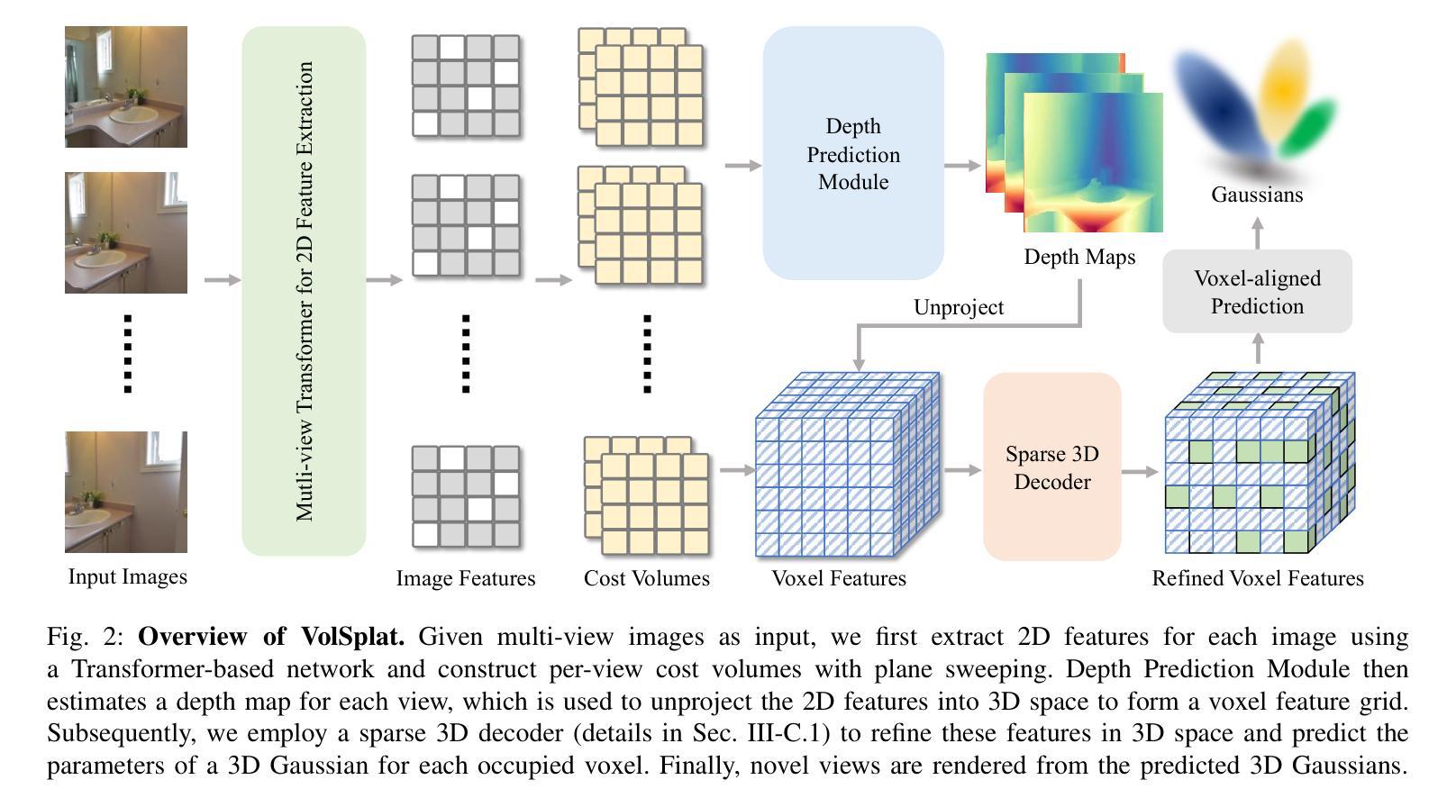 前馈三维高斯展布(3DGS)已成为一种用于合成新视角的高效解决方案。现有方法主要依赖于像素对齐的高斯预测范式,其中每个二维像素被映射到三维高斯上。我们重新思考这一广泛应用的方法并发现了几个固有的局限性:它使得重建的3D模型严重依赖于输入视角的数量,导致视角偏向的密度分布,并在源视角包含遮挡或低纹理时引入对齐误差。为了解决这些挑战,我们引入了VolSplat,这是一种新的前馈多视角范式,它用体素对齐的高斯替换了像素对齐。通过直接从预测的3D体素网格预测高斯值,它克服了像素对齐对容易出现错误的二维特征匹配的依赖,确保了稳健的多视角一致性。此外,它可以根据3D场景的复杂性对高斯密度进行自适应控制,产生更真实的高斯点云、改进几何一致性和提高新颖视角的渲染质量。在包括RealEstate10K和ScanNet在内的常用基准测试上的实验表明,VolSplat达到了最先进的性能,同时产生了更合理和视角一致的高斯重建。除了优越的结果外,我们的方法为前馈三维重建建立了一个更可扩展的框架,具有更密集和更稳健的表示形式,为更广泛的社区中的进一步研究铺平了道路。视频结果、代码和训练模型可在我们的项目页面找到:https://lhmd.top/volsplat。