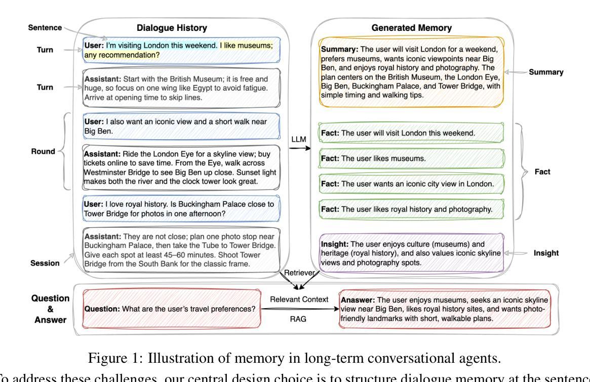 - 长期对话机器人需要有效管理内存来应对超出大型语言模型上下文窗口的对话历史。