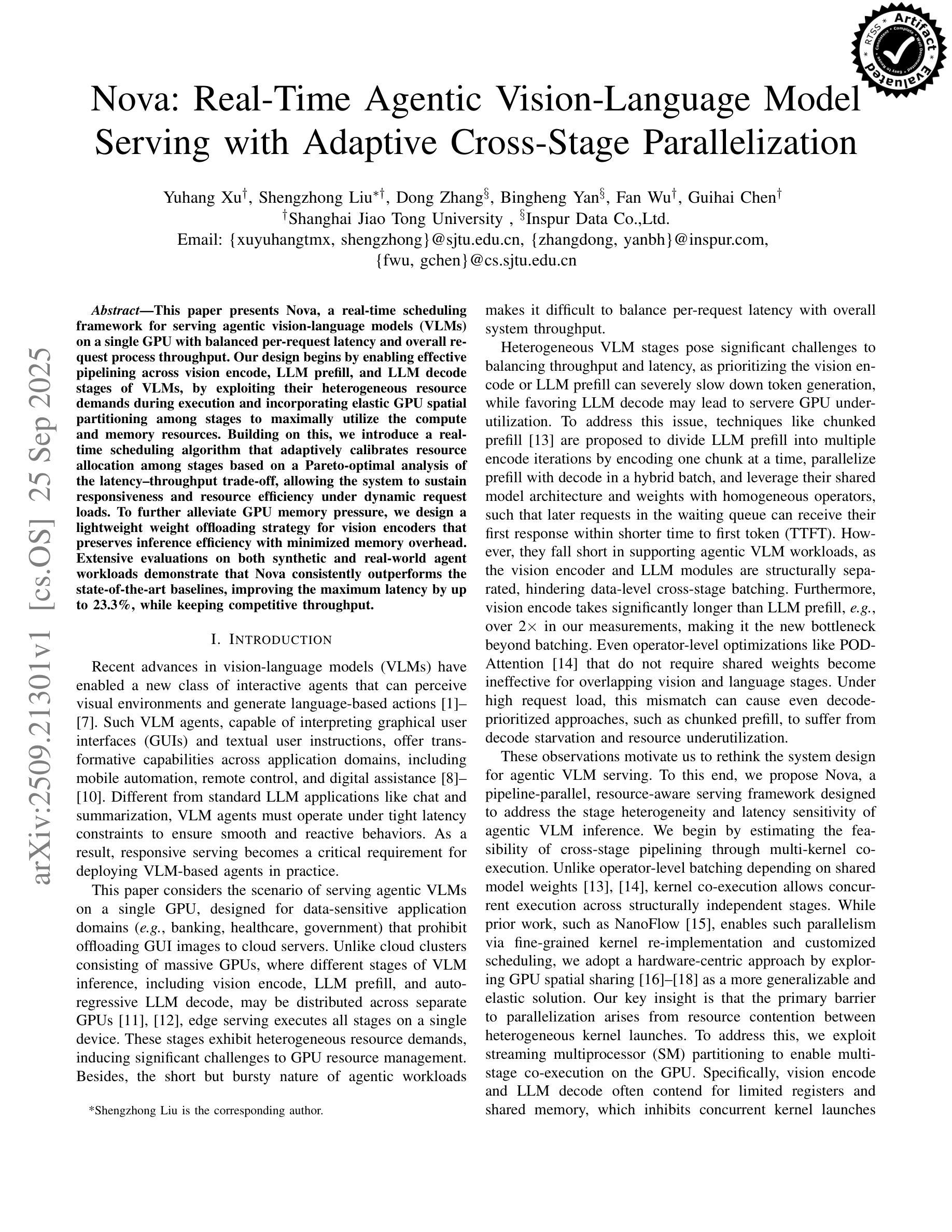 该论文介绍了Nova,一个为单一GPU上服务代理视觉语言模型(VLMs)提供实时调度框架。Nova通过管道化设计,有效应对VLMs的异构资源需求,并引入实时调度算法,根据延迟和吞吐量的帕累托最优分析自适应调整资源分配。此外,Nova还设计了一种轻量级卸载策略以减轻GPU内存压力。实验表明,Nova在性能上超越现有技术,最大延迟降低了高达23.3%,同时保持竞争力吞吐量。