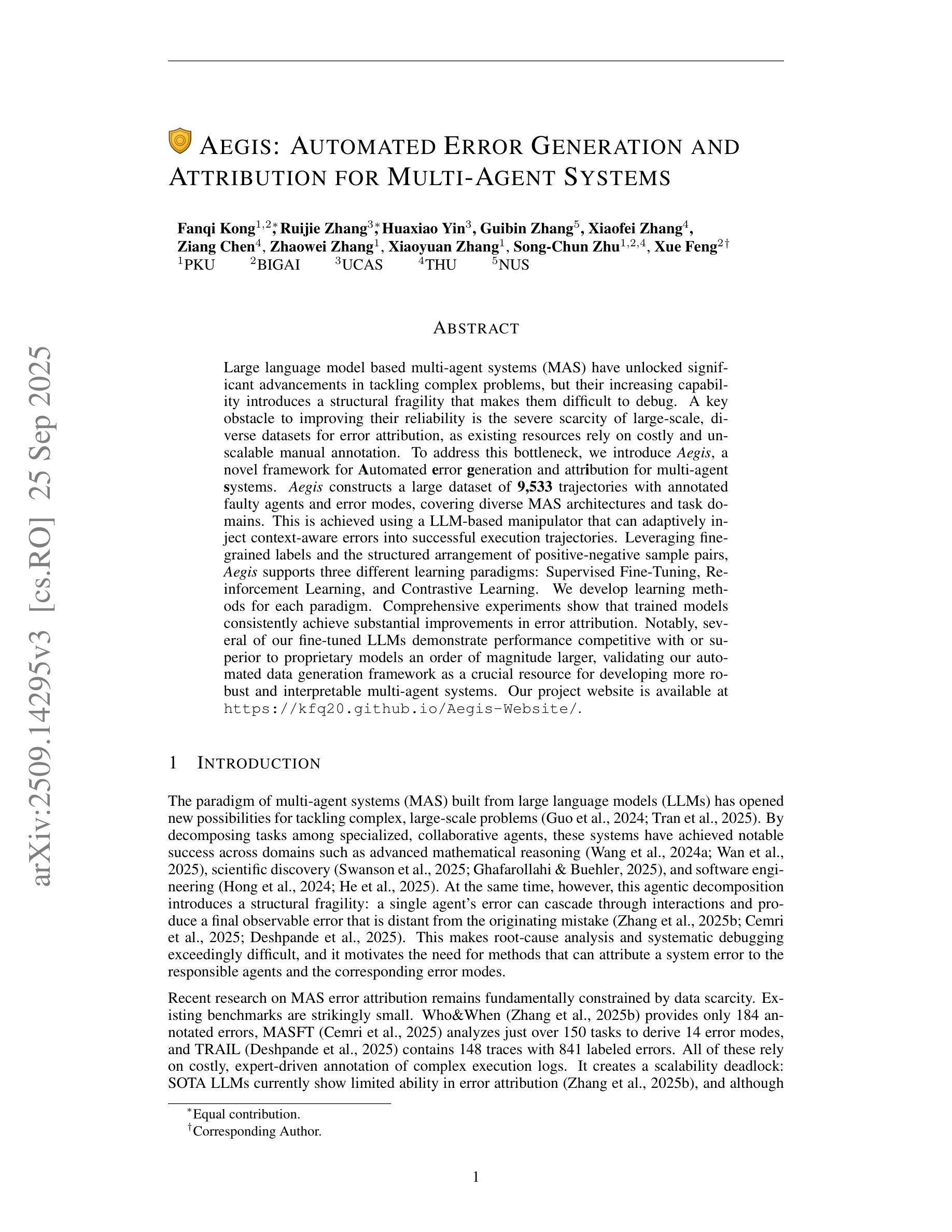 随着多智能体系统(MAS)的自主性和复杂性不断提高,理解它们的错误模式对于确保它们的可靠性和安全性至关重要。然而,由于缺乏大规模、多样化的精确地面真实错误标签数据集,这一领域的研究受到了严重阻碍。为了解决这一瓶颈问题,我们引入了\textbf{AEGIS},这是一个用于多智能体系统的自动化错误生成和识别的新型框架。我们通过系统性地在初始成功轨迹中注入可控和可追踪的错误,创建了一个丰富的现实失败数据集。这是通过基于上下文感知、大型语言模型的自适应操纵器实现的,该操纵器执行诸如提示注入和响应腐败之类的复杂攻击,以产生特定的预定义错误模式。我们通过探索错误识别任务的三种独特学习范式来证明我们数据集的价值:有监督微调、强化学习和对比学习。我们的全面实验表明,在AEGIS数据上训练的模型在这三种学习范式中都取得了重大改进。值得注意的是,我们微调的几个模型的性能与或优于一个数量级更大的专有系统,这验证了我们的自动化数据生成框架对于开发更稳健和可解释的多智能体系统是一个至关重要的资源。我们的项目网站可在https://kfq20.github.io/AEGIS-Website访问。