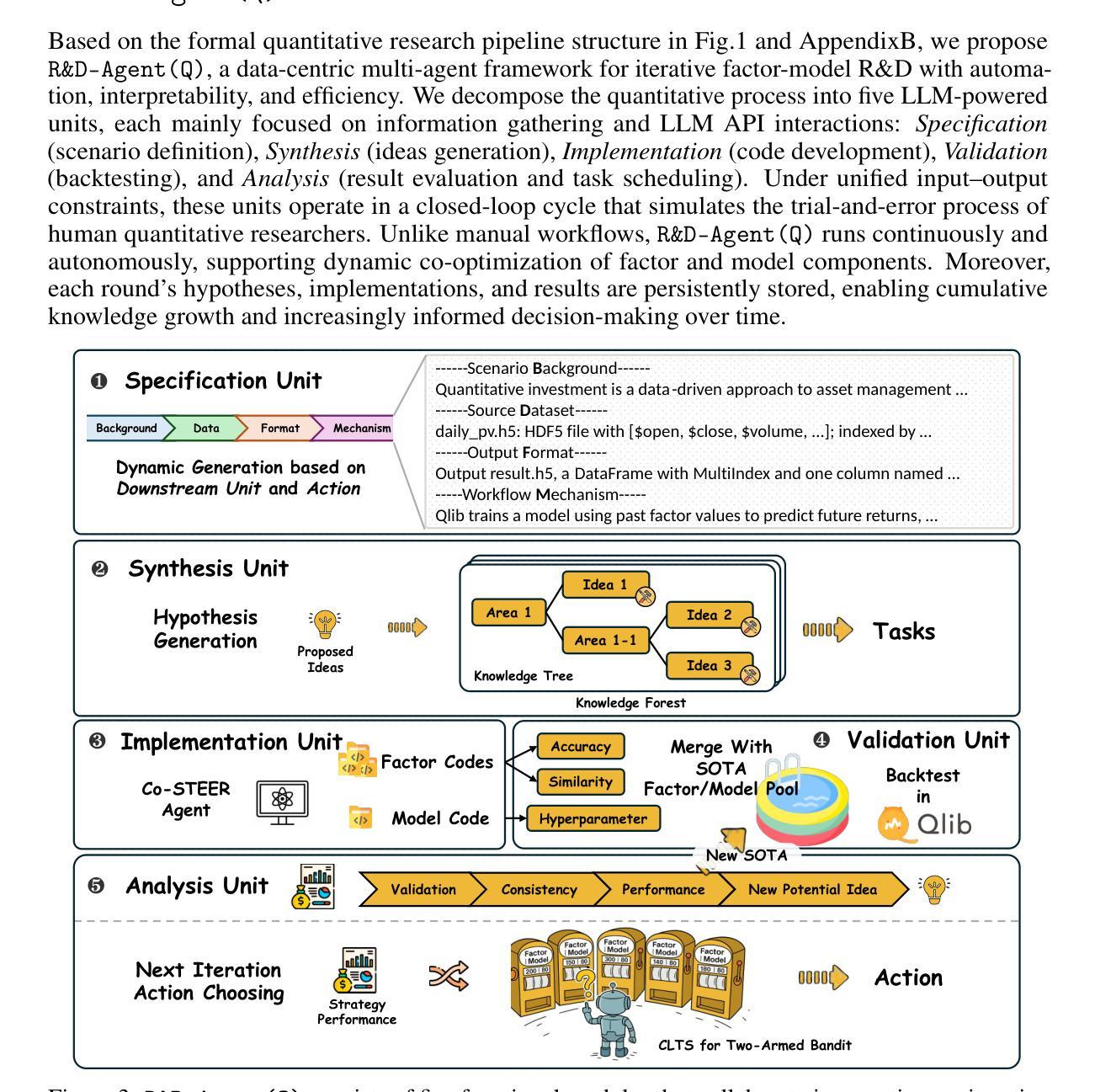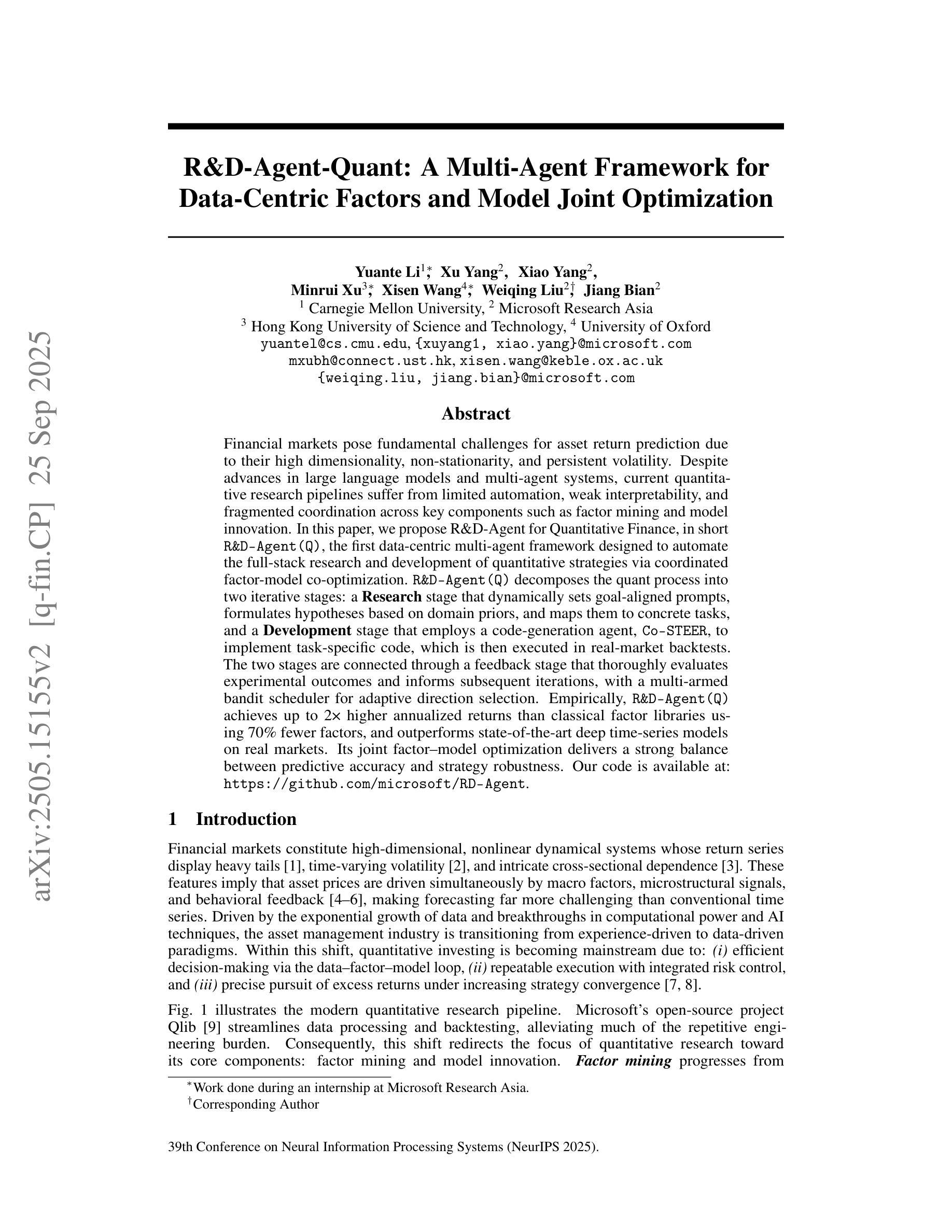 金融市场由于其高维性、非稳定性和持续波动性,对资产回报预测构成了根本性挑战。尽管大型语言模型和多元代理系统有所进展,但目前的定量研究管道在自动化、可解释性方面存在局限,且在因子挖掘和模型创新等关键组件之间的协调碎片化。在本文中,我们提出了针对金融量化的R&D-Agent,简称RD-Agent(Q),这是首个以数据为中心的多代理框架,旨在通过协调的因子模型协同优化来自动化定量策略的全栈研发。RD-Agent(Q)将量化过程分解为两个迭代阶段:研究阶段动态设置目标对齐的提示,基于领域先验制定假设,并将其映射为具体任务;开发阶段则利用代码生成代理Co-STEER来执行特定任务的代码,随后在真实市场中进行回测。两个阶段通过反馈阶段连接,该阶段对实验结果进行全面评估并为后续迭代提供信息,同时使用多臂匪徒调度器进行自适应方向选择。实证表明,RD-Agent(Q)使用70%更少的因素实现了高达两倍于传统因素库的年化收益率,并且在真实市场上优于最新深度时间序列模型。其联合因子模型优化在预测精度和策略稳健性之间达到了良好的平衡。我们的代码可在:https://github.com/microsoft/RD-Agent上找到。