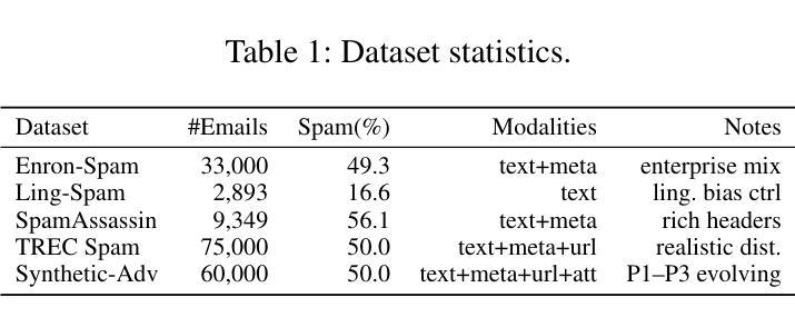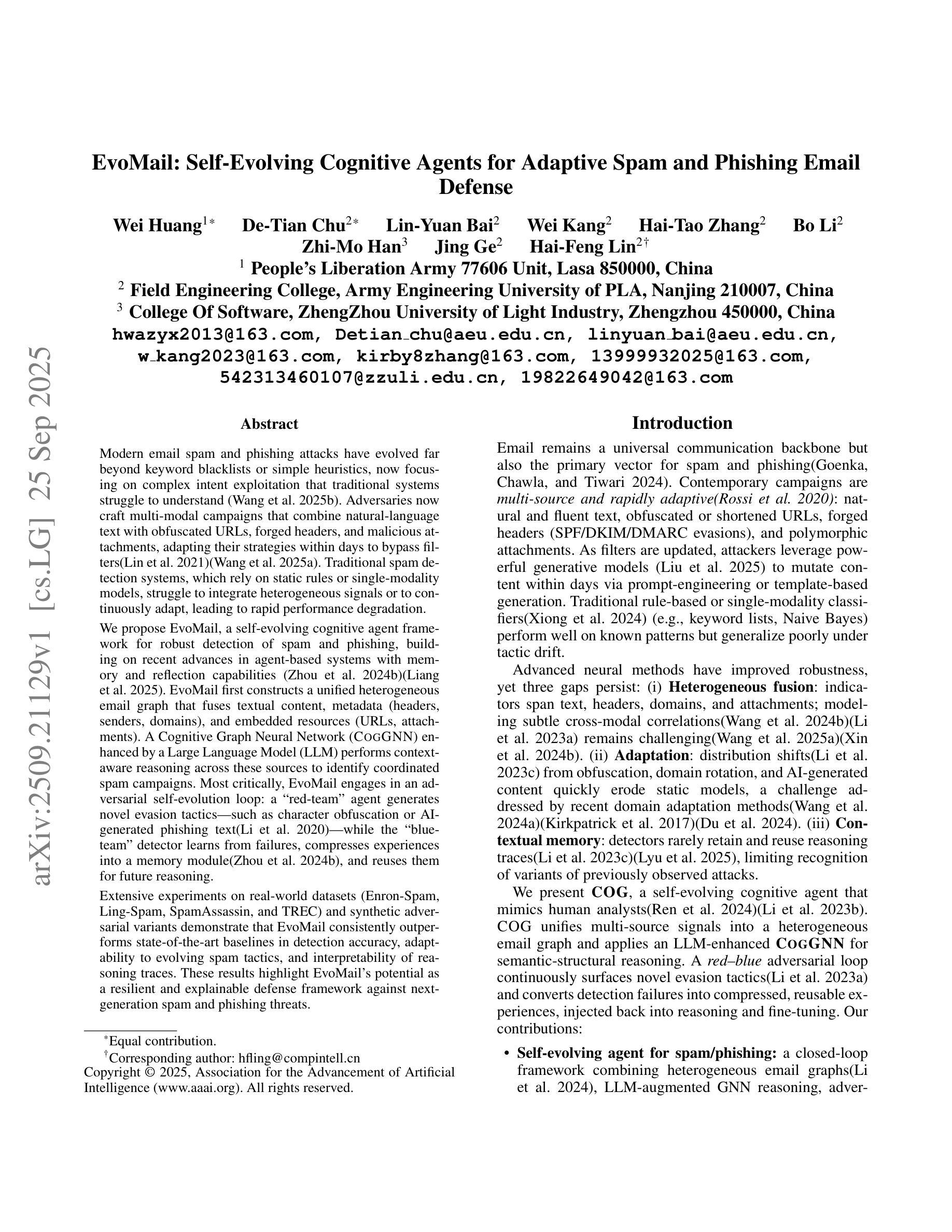 现代电子邮件垃圾邮件和钓鱼攻击已经超越了关键词黑名单或简单启发式方法。对手现在采用多模式活动,结合自然语言文本、模糊网址、伪造标题和恶意附件,并在几天内调整策略绕过过滤器。传统的垃圾邮件检测系统依赖于静态规则或单模态模型,难以整合异构信号或持续适应,导致性能迅速下降。我们提出EvoMail,一种自进化认知代理框架,用于稳健地检测垃圾邮件和钓鱼邮件。EvoMail首先构建一个统一的异构电子邮件图,融合了文本内容、元数据(标题、发送者、域名)和嵌入式资源(网址、附件)。一个由大型语言模型增强的认知图神经网络在这些来源上执行上下文感知推理,以识别协同的垃圾邮件活动。最重要的是,EvoMail参与对抗性自进化循环:红队代理生成新的规避策略,如字符模糊或AI生成的钓鱼文本,而蓝队检测器从失败中学习,将经验压缩到记忆模块中并重复用于未来推理。在真实数据集(如Enron-Spam、Ling-Spam、SpamAssassin和TREC)和合成对抗变体上的广泛实验表明,EvoMail在检测准确性、适应不断变化的垃圾邮件策略以及推理痕迹的可解释性方面均优于最新基线。这些结果突显了EvoMail作为对抗下一代垃圾邮件和钓鱼威胁的坚韧且可解释性强的防御框架的潜力。