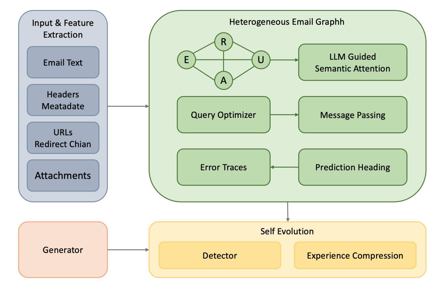 现代电子邮件垃圾邮件和钓鱼攻击已经远远超越了关键词黑名单或简单启发式方法。现在,攻击者会制造多模式活动,将自然语言文本与模糊URL、伪造标题和恶意附件相结合,并在几天内调整他们的策略以绕过过滤器。传统垃圾邮件检测系统依赖于静态规则或单模态模型,难以整合异构信号或持续适应,导致性能迅速下降。我们提出了EvoMail,这是一个用于稳健检测垃圾邮件和钓鱼的自进化认知代理框架。EvoMail首先构建一个统一的异构电子邮件图,融合了文本内容、元数据(标题、发送者、域名)和嵌入式资源(URL、附件)。一个由大型语言模型(LLM)增强认知图神经网络在这类来源中进行上下文感知推理,以识别协调的垃圾邮件活动。最重要的是,EvoMail参与了一个对抗性自我进化循环:“红队”代理生成新的躲避技巧,如字符模糊或AI生成的钓鱼文本,而“蓝队”检测器从失败中学习,将经验压缩到内存模块中,并重新用于未来的推理。在真实数据集(如Enron-Spam、Ling-Spam、SpamAssassin和TREC)以及合成对抗性变种上的广泛实验表明,EvoMail在检测精度、适应不断变化的垃圾邮件策略以及推理痕迹的可解释性方面均优于最新基线。这些结果突显了EvoMail作为抵御新一代垃圾邮件和钓鱼威胁的坚韧且可解释性强的防御框架的潜力。