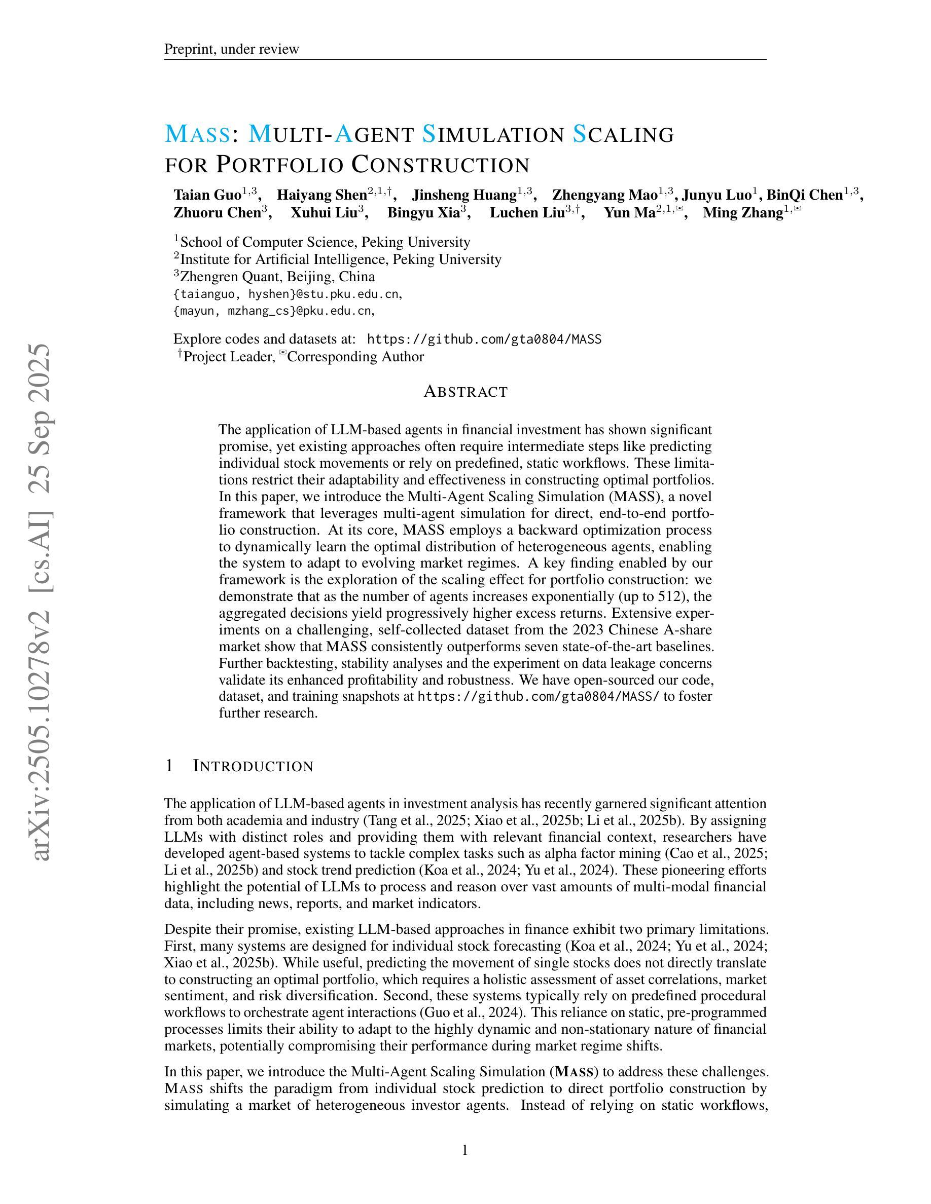 基于大语言模型(LLM)的代理在金融投资中的应用前景广阔,但现有方法通常需要预测个股走势等中间步骤,或者依赖于预定义、静态的工作流程。这些限制影响了它们在构建最优投资组合时的适应性和有效性。在本文中,我们介绍了多智能体规模仿真(MASS)这一新型框架,它利用多智能体仿真进行直接端到端的投资组合构建。其核心是MASS采用逆向优化过程来动态学习异质智能体的最佳分布,使系统能够适应不断变化的市场状况。我们的框架所带来的一个关键发现是探索投资组合构建中的规模效应:我们证明随着智能体数量的指数增长(最多至512个),智能体集体做出的决策产生的超额回报逐渐增加。在来自2023年中国A股市场自我收集的具有挑战性的数据集上进行的广泛实验表明,MASS持续优于七种最新技术水平的基线。进一步的反向测试、稳定性分析和数据泄露问题实验验证了其盈利能力和稳健性的提升。我们已在https://github.com/gta0804/MASS/开源我们的代码、数据集和培训快照,以促进进一步的研究。