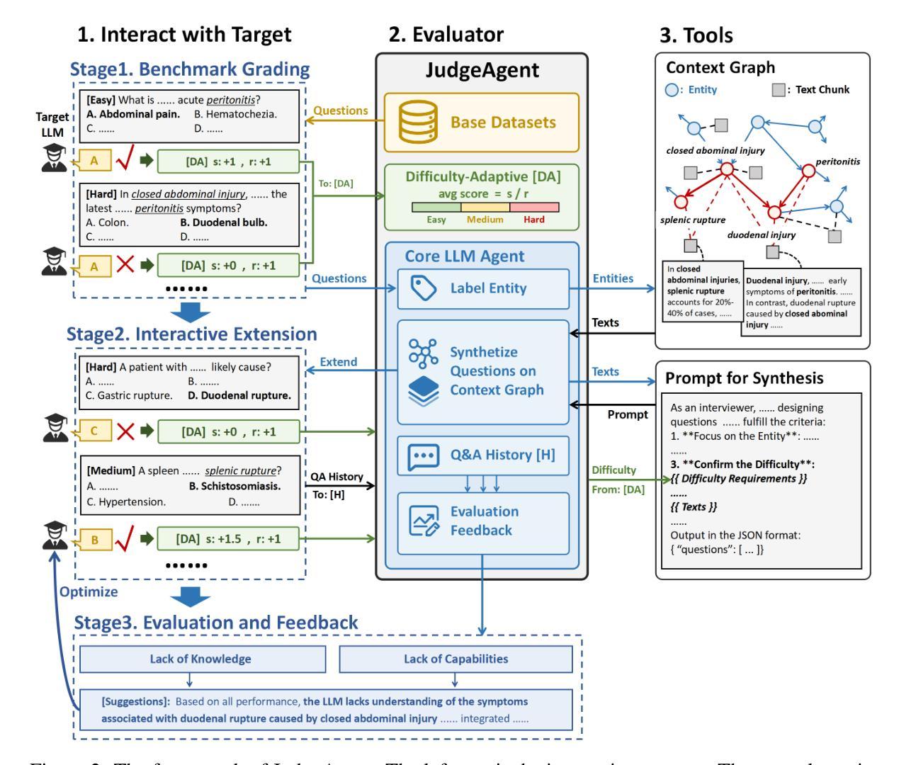 - JudgeAgent知识动态评价体系采用知识驱动合成和难度评分策略,提供优化建议。