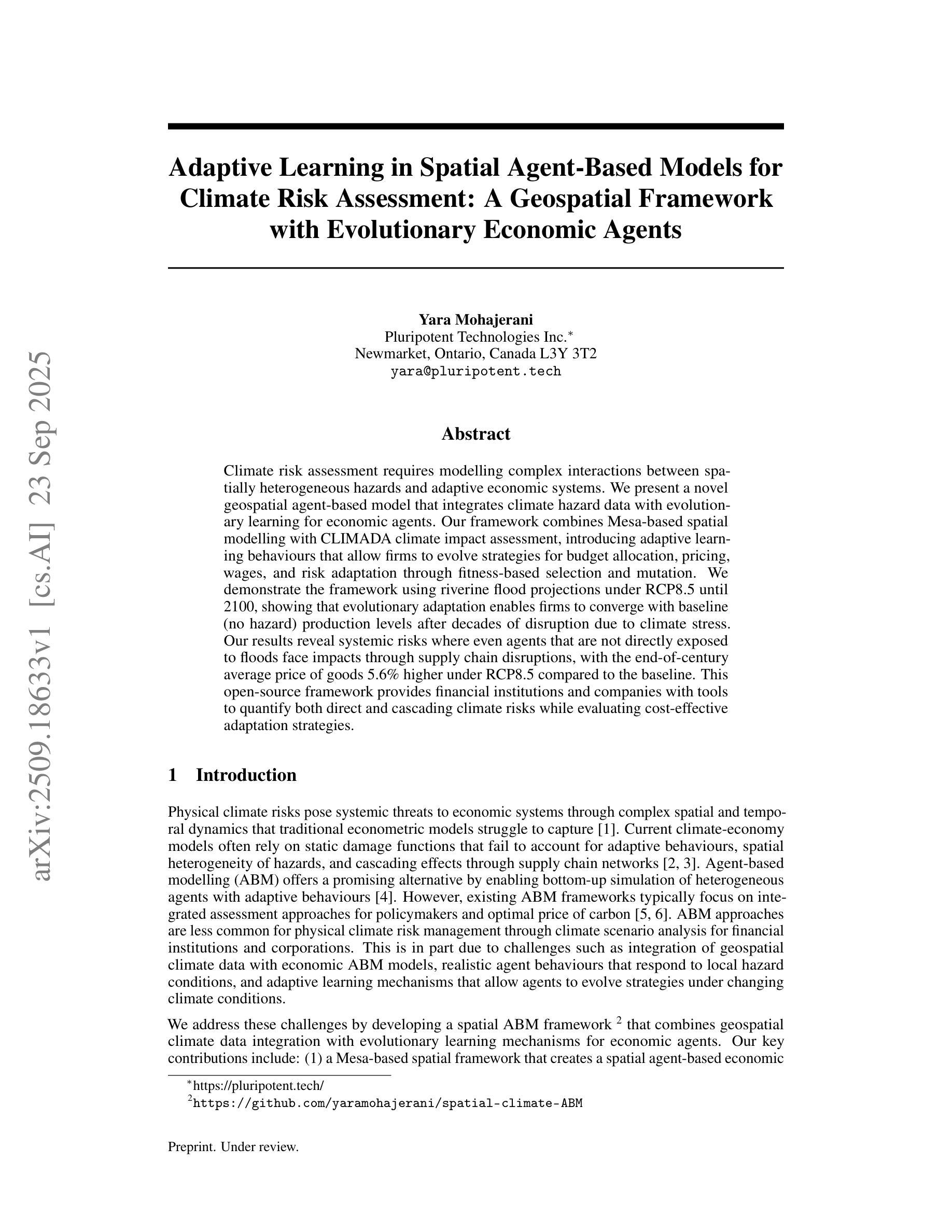 气候风险评估需要模拟空间异质性危害与自适应经济系统之间的复杂交互。我们提出了一种新型基于地理空间的主体模型,该模型将气候危害数据与主体的进化学习相结合,用于评估经济系统。我们的框架结合了基于梅萨的空间建模与CLIMADA气候影响评估,引入了自适应学习行为,使企业能够通过基于适应度的选择和变异来进化策略,为预算分配、定价、工资和风险适应制定策略。我们以RCP8.5情景下直至2100年的河流洪水预测为例来展示该框架的应用,表明通过几十年的气候压力带来的破坏后,进化适应使企业能够收敛到基线(无危害)的生产水平。我们的研究结果显示,即使在供应链中断的情况下,没有直接暴露于洪水中的主体也会受到影响,到世纪末期的商品平均价格较基线水平在RCP8.5情景下高出5.6%。这一开源框架为金融机构和企业提供了量化直接和连锁气候风险的工具,同时评估成本效益高的适应策略。