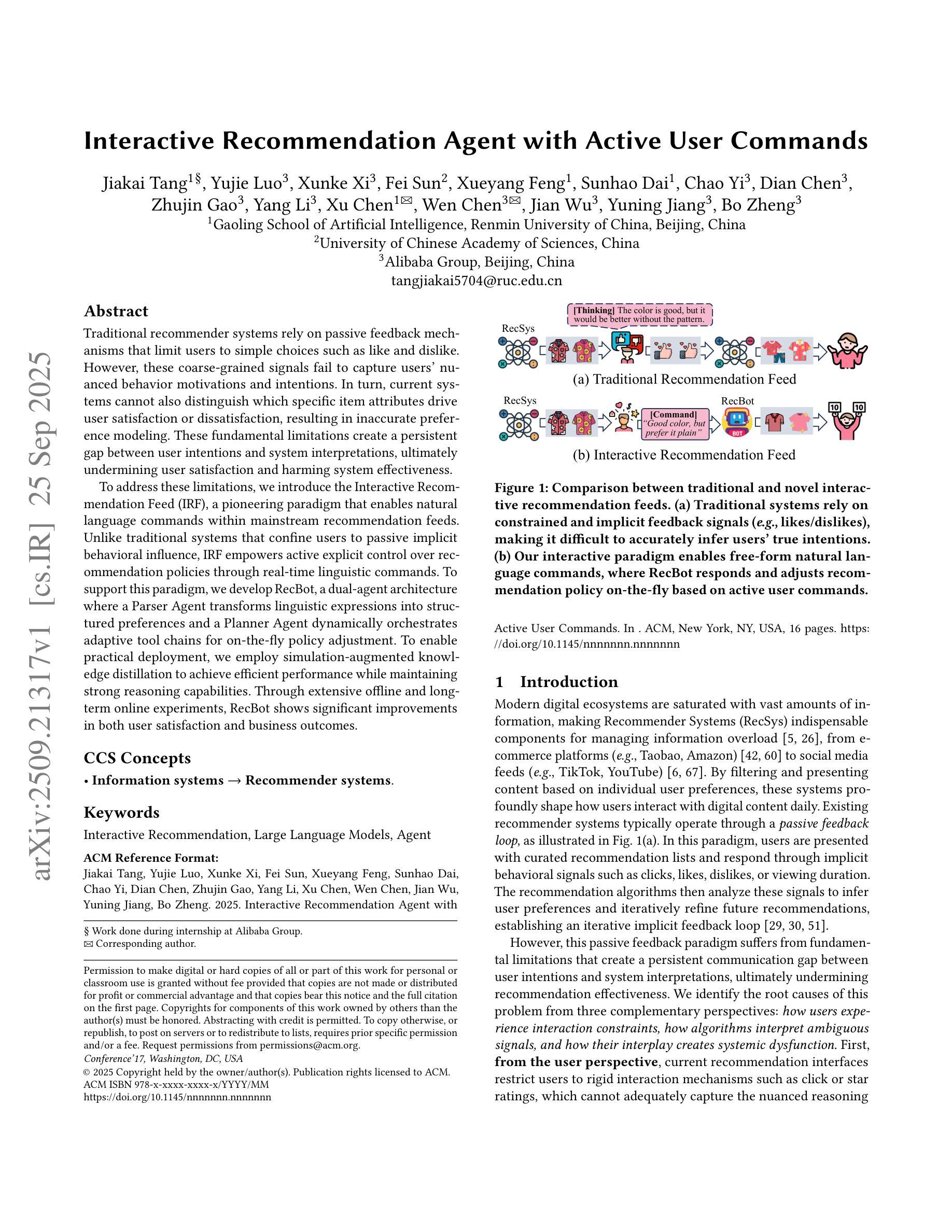 传统推荐系统依赖被动反馈机制,使用户只能选择简单的喜欢或不喜欢,这种粗粒度的信号无法捕捉用户复杂的行为动机和意图。为解决这一问题,我们提出了交互推荐馈(IRF)这一开创性理念,并在主流推荐系统中引入自然语言命令。IRF通过实时语言命令使用户能够主动控制推荐策略,而传统系统只能被动接受用户隐性行为影响。为实现这一理念,我们开发了RecBot系统,该系统包含解析器代理(将语言表达式转化为结构化偏好)和规划器代理(动态协调即时策略调整工具链)。通过模拟增强知识蒸馏技术,RecBot实现了高效性能并保持强大的推理能力。实验证明,RecBot在用户满意度和业务成果方面取得了显著改进。