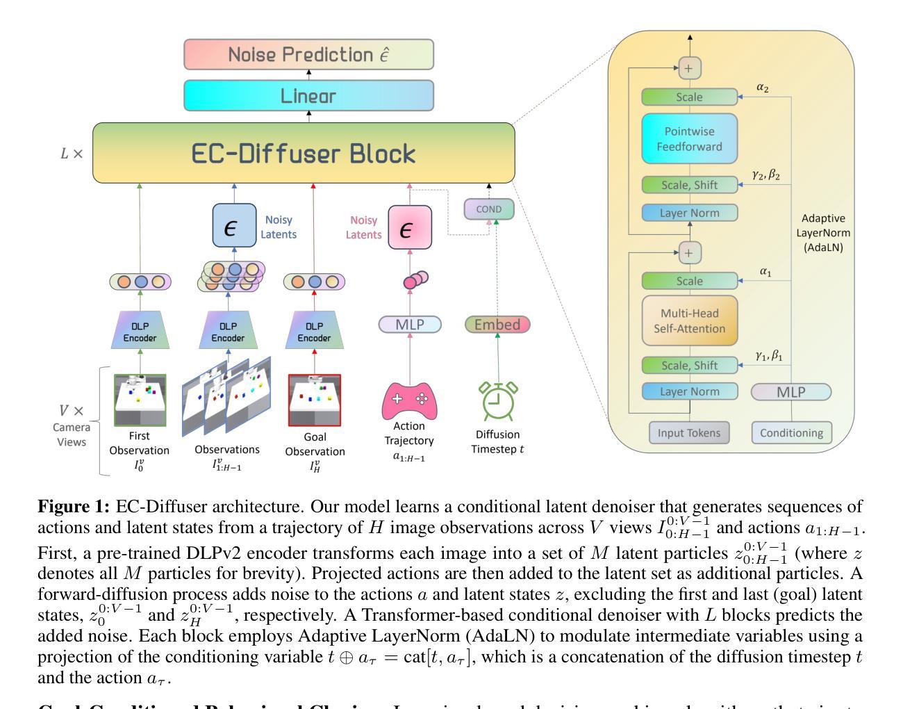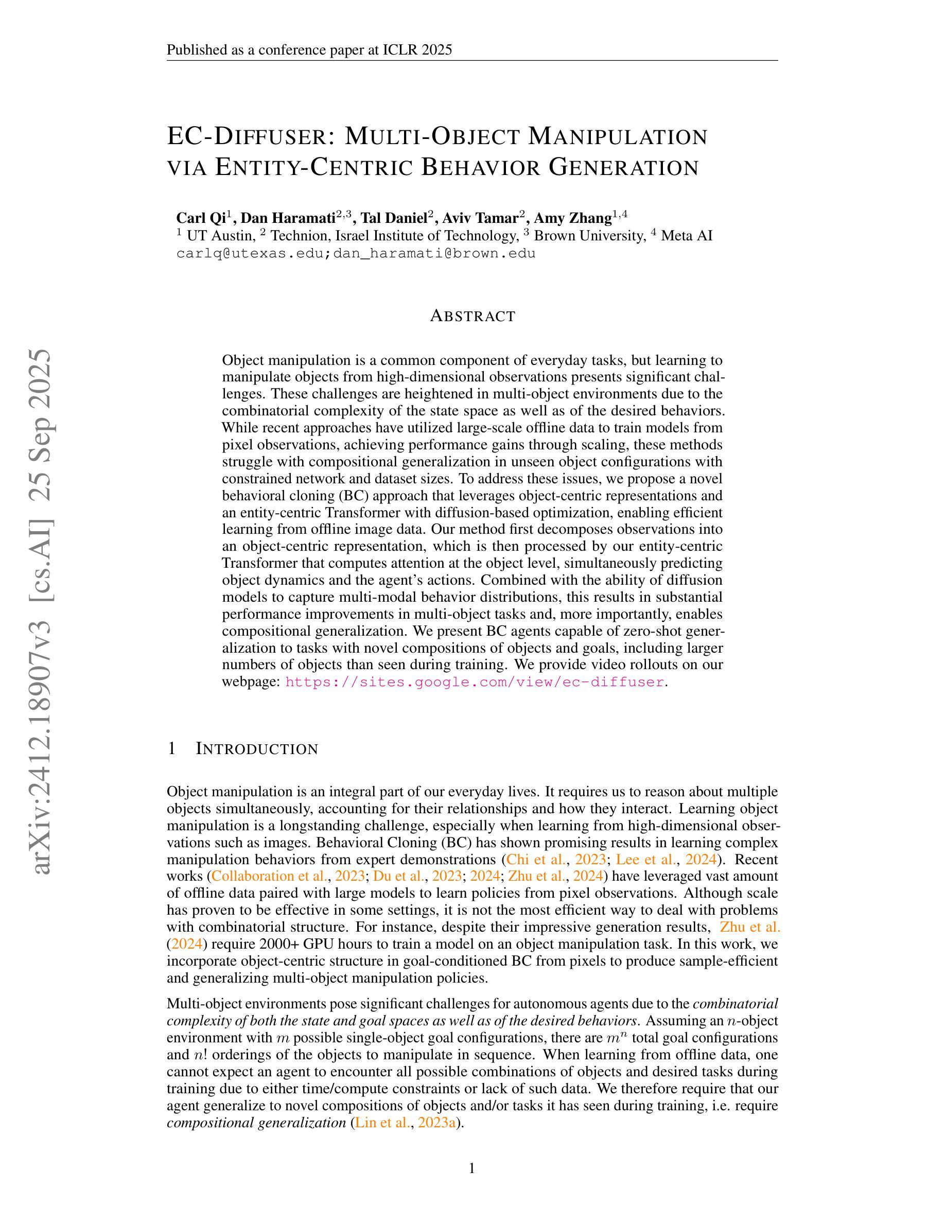 日常任务中常见物体操作这一环节,但从高维观察中学习物体操作仍存在诸多挑战。在多物体环境中,由于状态空间和所需行为的组合复杂性,这些挑战更为突出。虽然近期的方法利用大规模离线数据从像素观察中训练模型,并通过扩展实现性能提升,但这些方法在未见物体配置的组合泛化方面面临困难,且受网络和数据集大小的限制。为解决这些问题,我们提出了一种新型的行为克隆(BC)方法,该方法利用以物体为中心的表达和实体为中心的Transformer与基于扩散的优化,实现从离线图像数据的高效学习。我们的方法首先将观察结果分解为以物体为中心的表达,然后将其输入实体为中心的Transformer进行处理,该处理模块在物体层面计算注意力,同时预测物体动态和代理行为。结合扩散模型捕捉多模式行为分布的能力,这大大提高了多物体任务的性能,更重要的是,实现了组合泛化。我们展示了BC代理能够零样本泛化至具有新型物体和目标组合的任务,包括训练时未见过的更多物体。视频回放请见我们的网页:[网站链接](https://sites.google.com/view/ec-diffuser)。