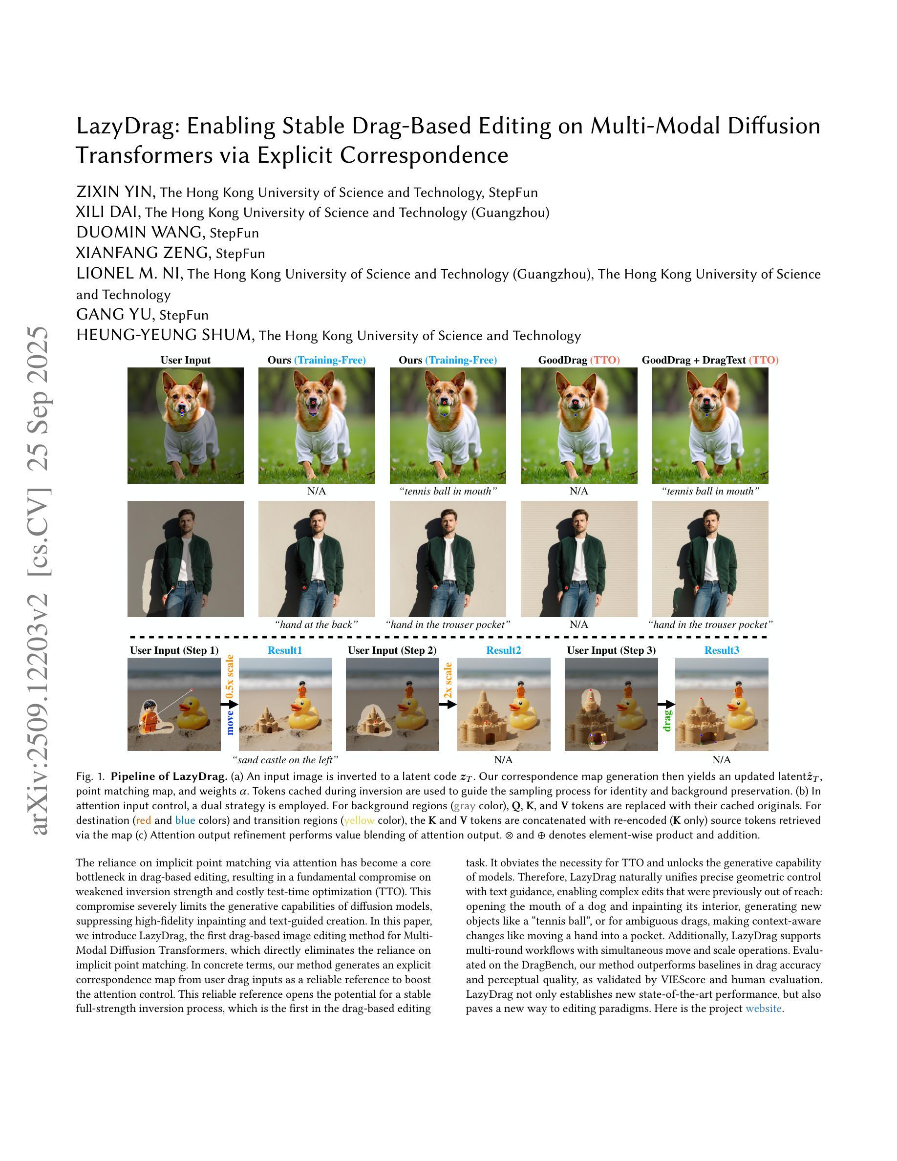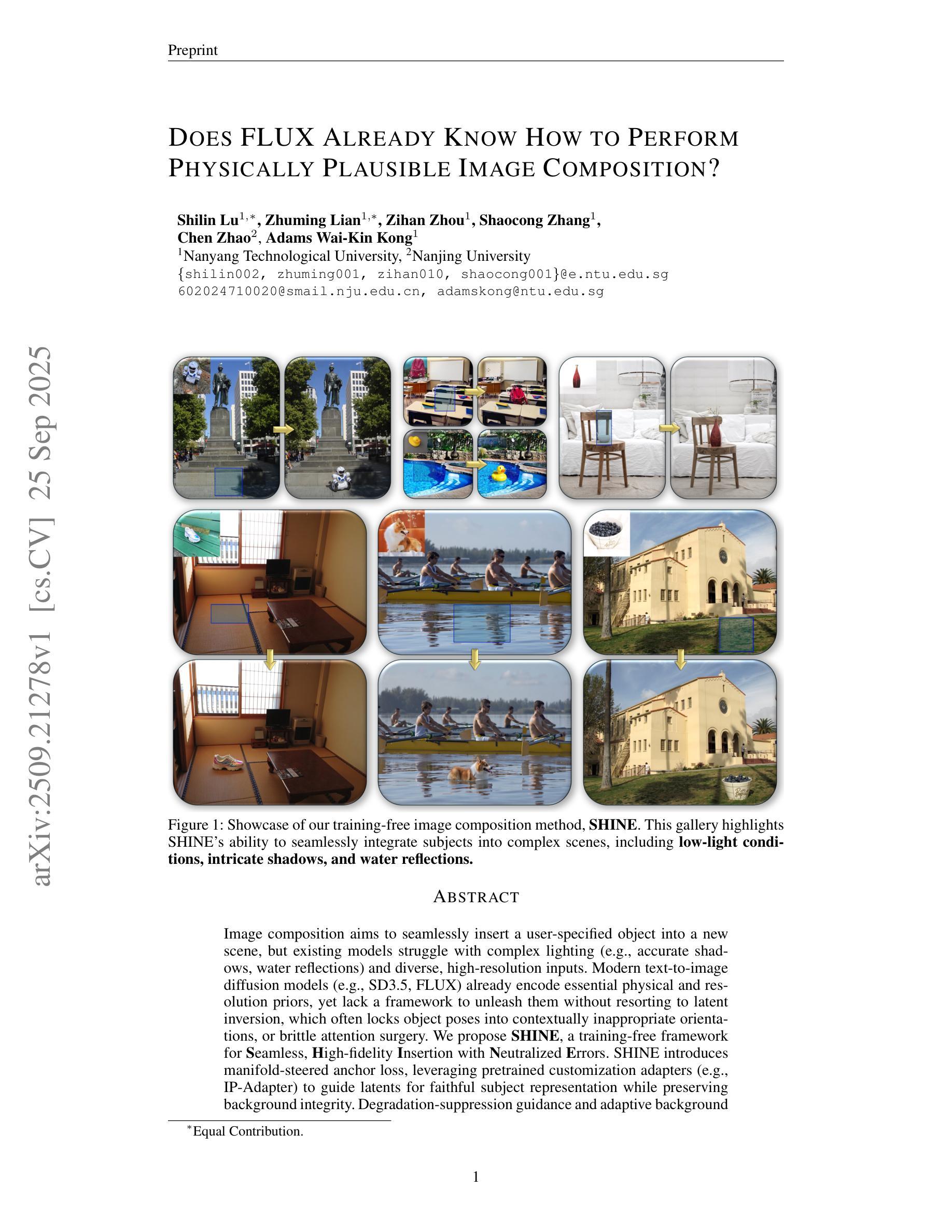 图像组合旨在无缝插入用户指定的对象到新场景中,但现有模型在处理复杂光照(例如准确阴影、水面反射)和多样化、高分辨率输入时遇到困难。现代文本到图像扩散模型(例如SD3.5、FLUX)已经编码了基本的物理和分辨率先验知识,但缺乏一个框架来释放它们,而不必求助于潜在的反演,这通常会将对象姿势锁定在上下文不适当的方向上,或脆弱的注意力手术。我们提出SHINE,这是一个无需训练的无缝、高保真插入中性化错误框架。SHINE引入了流形引导锚点损失,利用预训练的定制适配器(例如IP-Adapter)来引导潜在表示以忠实于主题表示,同时保持背景完整性。提出退化抑制指导和自适应背景融合,以进一步消除低质量输出和可见接缝。为了解决缺乏严格基准的问题,我们引入了ComplexCompo,它具有多种分辨率和挑战性条件,例如低光照、强照明、复杂的阴影和反射表面。在ComplexCompo和DreamEditBench上的实验表明,其在标准指标(例如DINOv2)和人类对齐分数(例如DreamSim、ImageReward、VisionReward)上均表现出卓越性能。代码和基准将在发布时公开。
