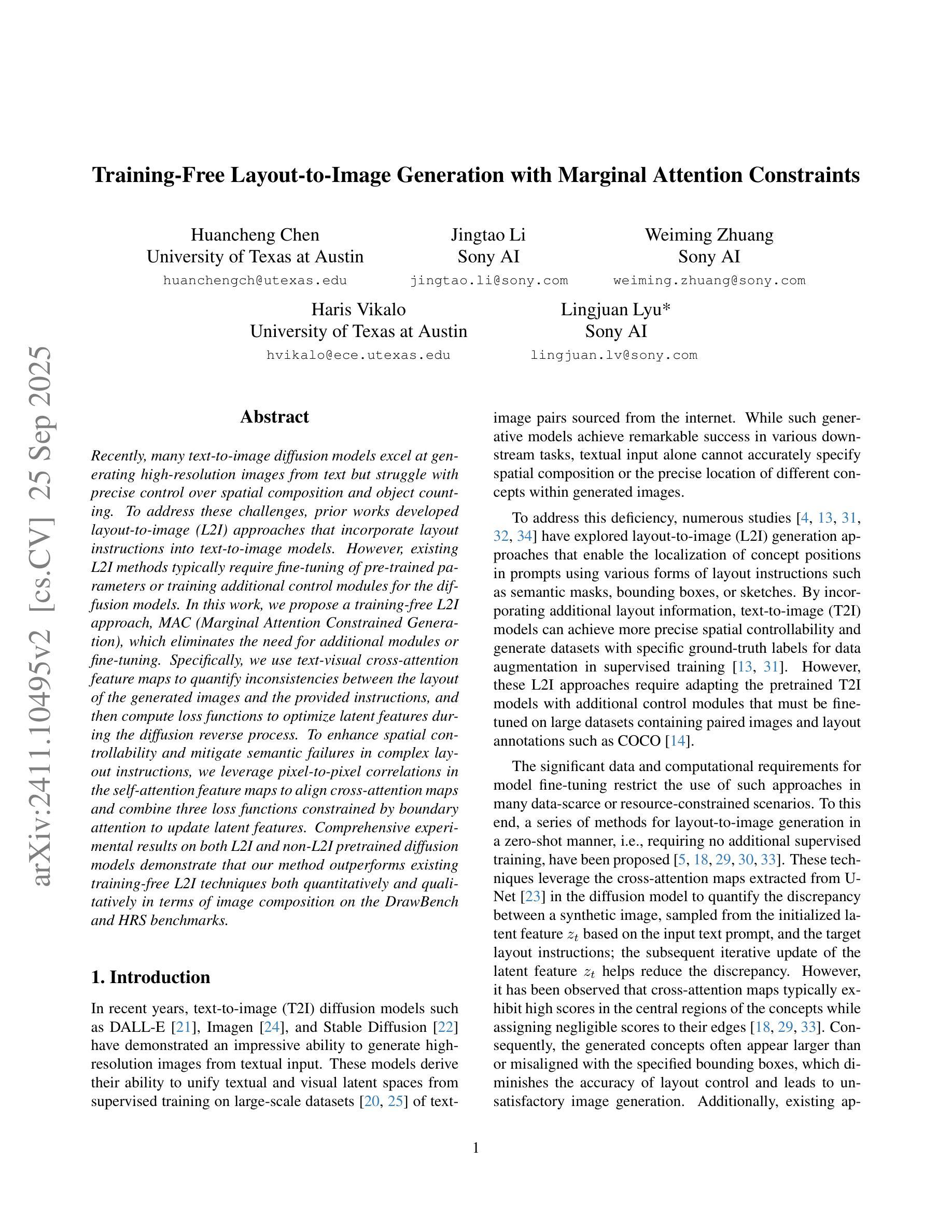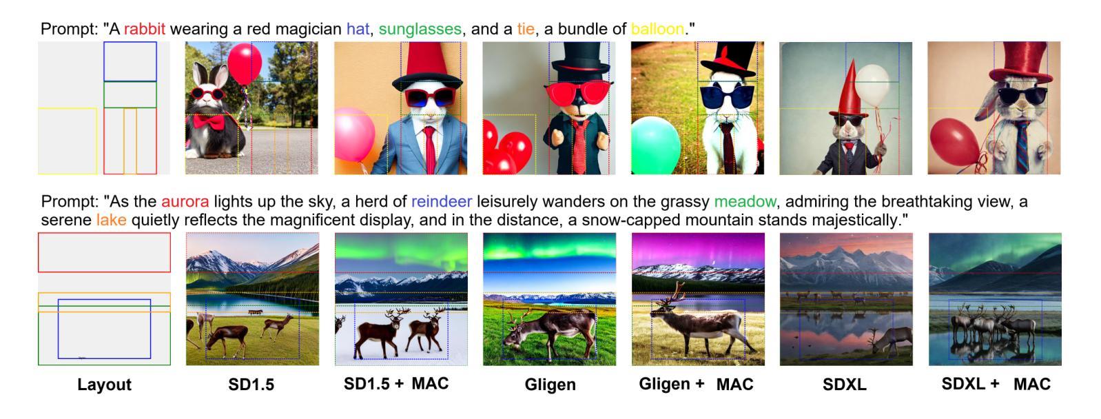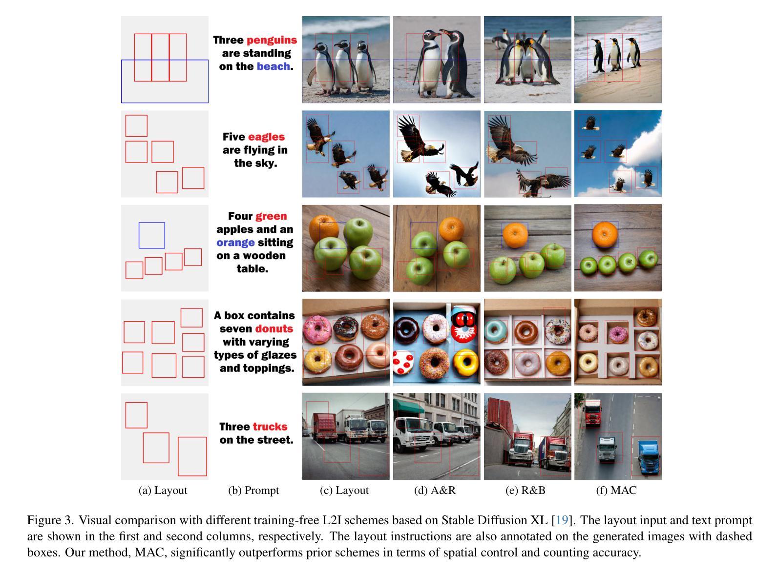 最近,许多文本到图像的扩散模型在根据文本生成高分辨率图像方面表现出色,但在空间构图和物体计数方面的精确控制上遇到了困难。为了解决这些挑战,早期的研究开发了布局到图像(L2I)的方法,将布局指令融入文本到图像模型中。然而,现有的L2I方法通常需要调整预训练参数或为扩散模型训练额外的控制模块。在这项工作中,我们提出了一种无需训练的L2I方法,名为MAC(边际注意力约束生成),它无需额外的模块或微调。具体来说,我们使用文本视觉交叉注意力特征图来量化生成图像布局与所提供指令之间的不一致性,然后计算损失函数,在扩散反转过程中优化潜在特征。为了提高空间可控性并缓解复杂布局指令中的语义错误,我们利用自注意力特征图中的像素到像素相关性来对齐交叉注意力图,并结合三种受边界注意力约束的损失函数来更新潜在特征。在L2I和非L2I预训练的扩散模型上的综合实验结果表明,我们的方法在DrawBench和HRS基准测试上,无论在数量上还是在质量上,都超越了现有的无需训练的L2I技术,特别是在图像构图方面。