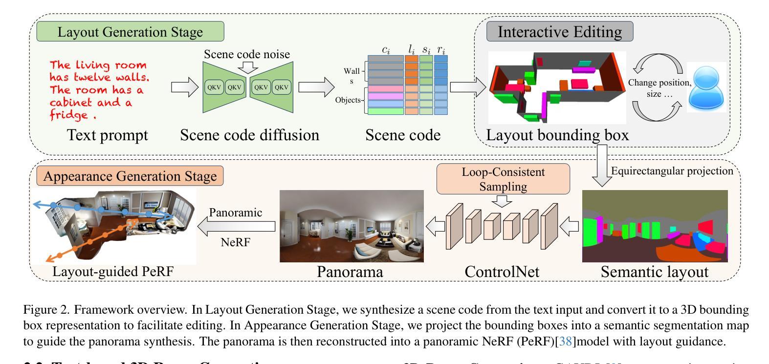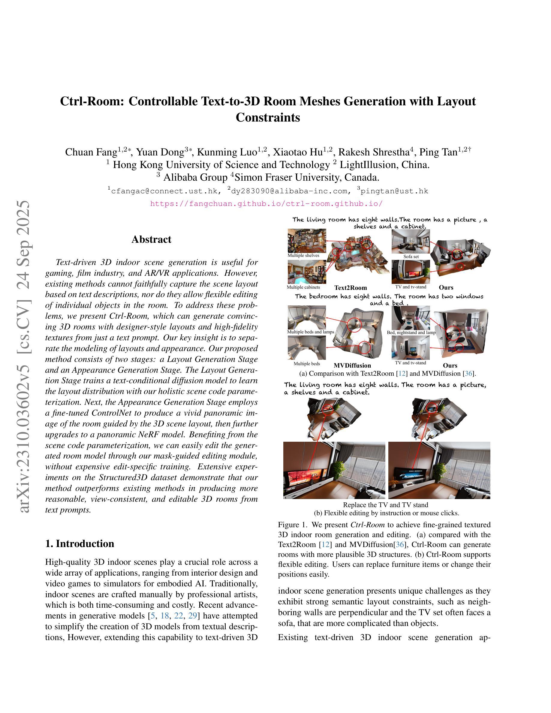 文本驱动的3D室内场景生成在游戏、电影产业和AR/VR应用中非常有用。然而,现有方法无法真实地捕捉房间布局,也不允许对房间中的单个物体进行灵活的编辑。为了解决这些问题,我们提出了Ctrl-Room,它仅通过文本提示就能生成具有设计师风格的布局和高保真纹理的令人信服的3D房间。此外,Ctrl-Room还支持多样化的交互编辑操作,如调整大小或移动单个家具项目。我们的关键见解是将布局和外观的建模分开。我们提出的方法分为两个阶段:布局生成阶段和外观生成阶段。布局生成阶段训练一个文本条件扩散模型,以通过我们的整体场景代码参数化来学习布局分布。接下来,外观生成阶段采用经过微调的控制网络(ControlNet),根据3D场景布局和文本提示生成生动的全景房间图像。因此,我们实现了具有令人信服的布局和生动纹理的高质量3D房间生成。得益于场景代码参数化,我们可以轻松通过我们的遮罩引导编辑模块编辑生成的房间模型,而无需进行昂贵的特定编辑训练。在Structured3D数据集上的大量实验表明,我们的方法在根据自然语言提示生成更合理、视角一致和可编辑的3D房间方面优于现有方法。