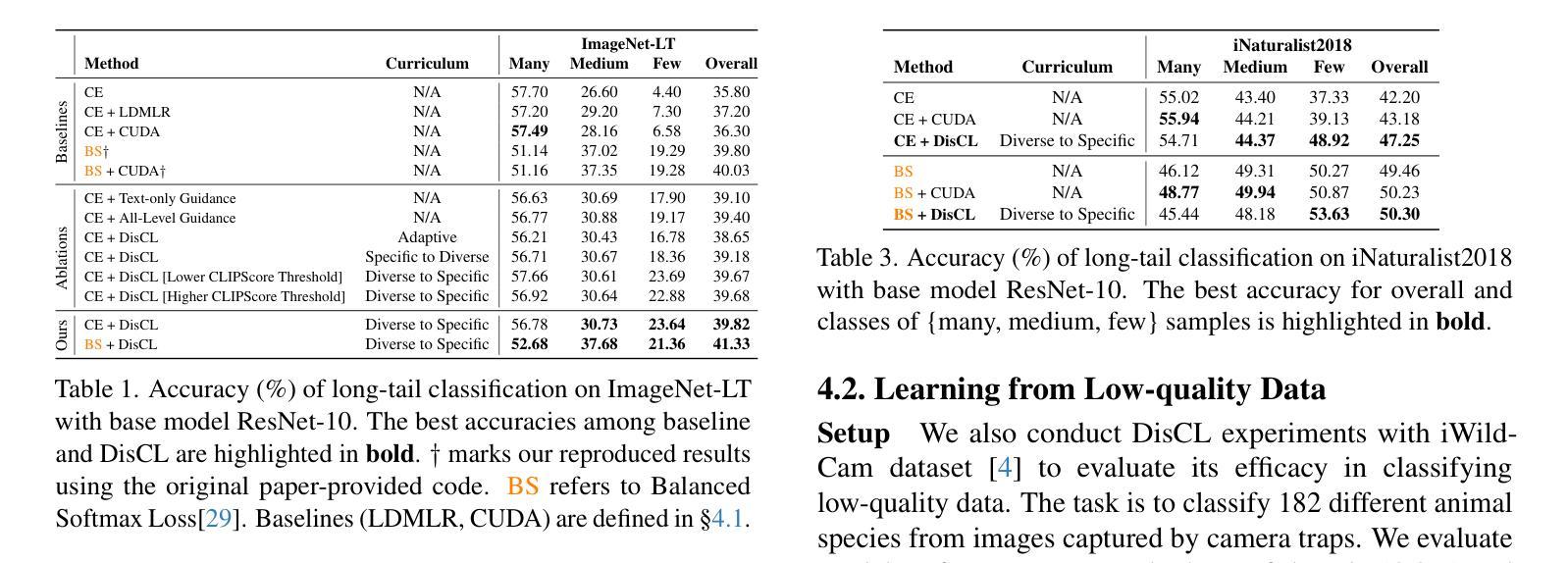 - DisCL在长尾分类任务中表现出显著的效果,特别是在低质量数据的处理方面。