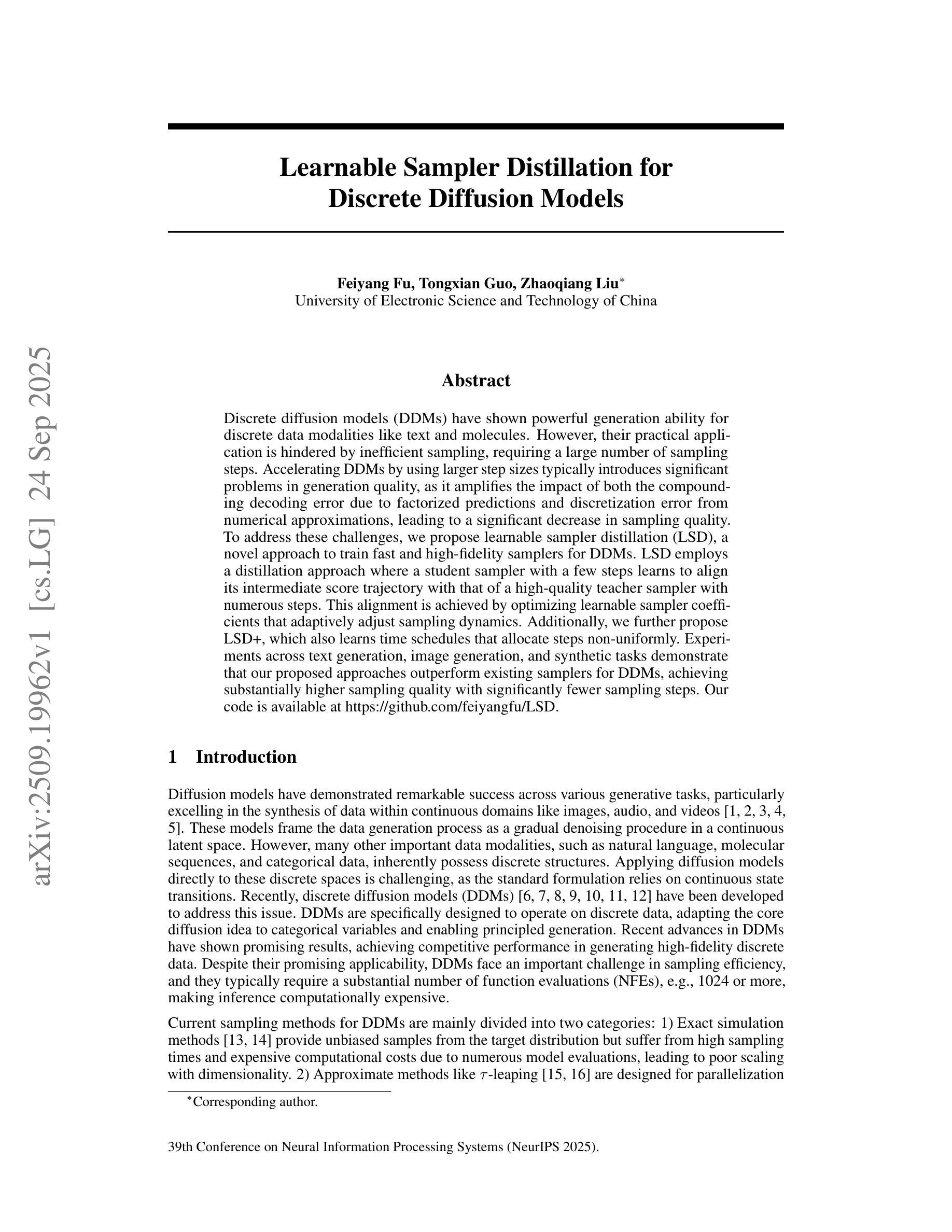 离散扩散模型(DDMs)已经显示出对离散数据模式(如文本和分子)的强大生成能力。然而,它们在实际应用中的采样效率低下,需要大量的采样步骤。通过增大步长来加速DDMs通常会引入严重的生成质量问题,因为它放大了由于分解预测和数值逼近引起的离散化误差,导致采样质量显著降低。为了解决这些挑战,我们提出了可学习采样器蒸馏(LSD)这一新方法,用于训练DDMs的快速高保真采样器。LSD采用了一种蒸馏方法,其中具有几步的学生采样器学习使其中间分数轨迹与具有多步的高质量教师采样器的轨迹对齐。这种对齐是通过优化可学习采样器系数来实现的,这些系数可以自适应地调整采样动态。此外,我们还进一步提出了LSD+,它还学习非均匀分配步骤的时间表。在文本生成、图像生成和合成任务上的实验表明,我们提出的方法在DDMs的采样器上优于现有技术,在大大减少采样步骤的情况下实现了更高的采样质量。我们的代码可在https://github.com/feiyangfu/LSD找到。