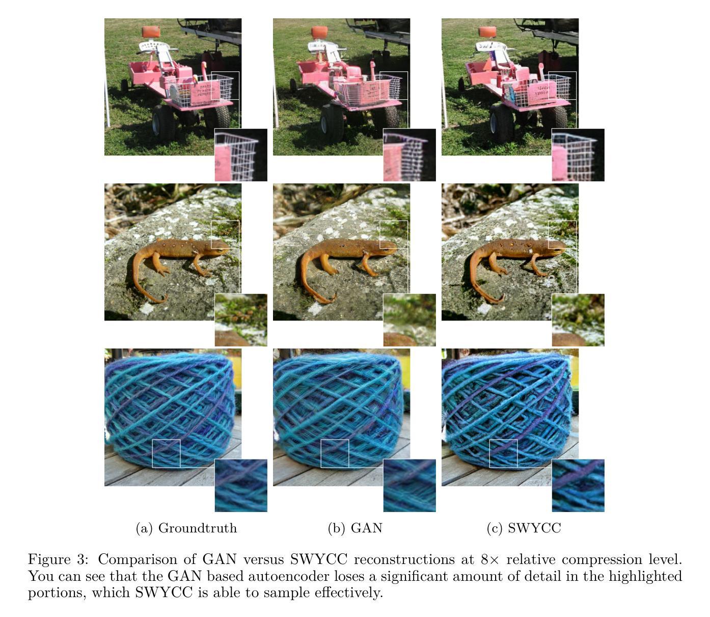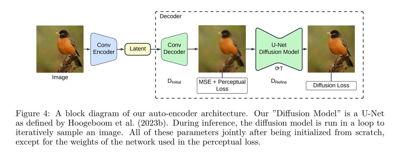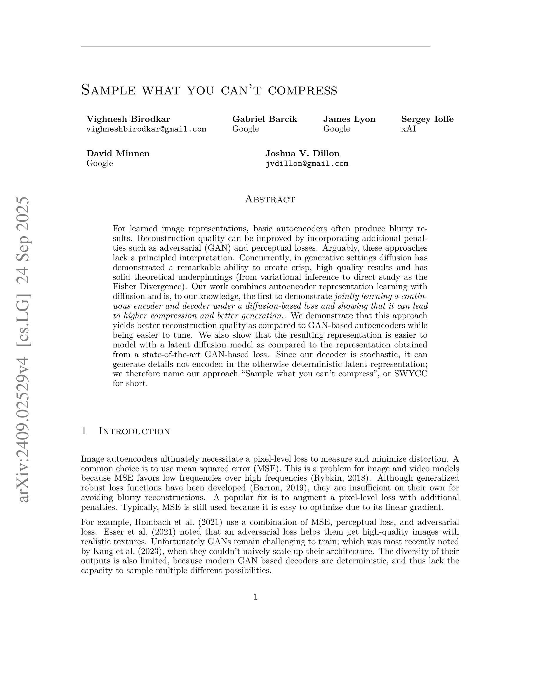 基于学习到的图像表示,基本自编码器通常会产生模糊的结果。为提高重建质量,可以引入对抗性(GAN)和感知损失等额外惩罚。然而,这些方法缺乏原则性的解释。同时,扩散在生成环境中表现出了惊人的创建清晰、高质量结果的能力,并有坚实的理论基础(从变分推断到直接研究费舍尔散度)。我们的工作结合了自编码器表示学习与扩散,据我们所知,是首次展示在扩散损失下联合学习连续编码器和解码器,并表明它可以实现更高的压缩率和更好的生成效果。我们证明,与其他基于GAN的自编码器相比,我们的方法具有更好的重建质量,且更易于调整。我们还表明,与来自最先进的基于GAN的损失所获得的表示相比,使用我们方法得到的表示更容易用潜在扩散模型建模。由于我们的解码器是随机的,它可以生成未编码在确定性潜在表示中的细节;因此,我们将我们的方法命名为“压缩所不能采样的”,简称SWYCC。
