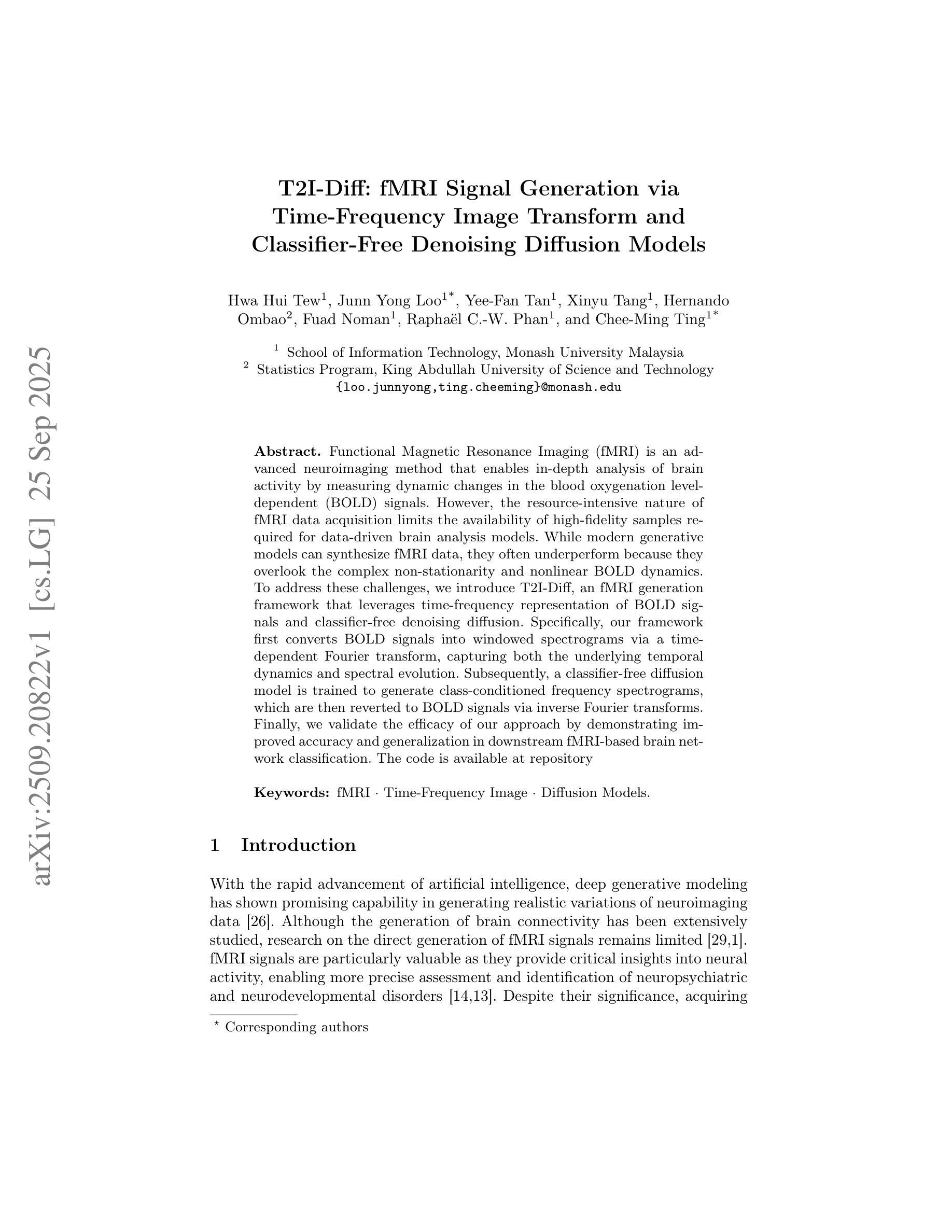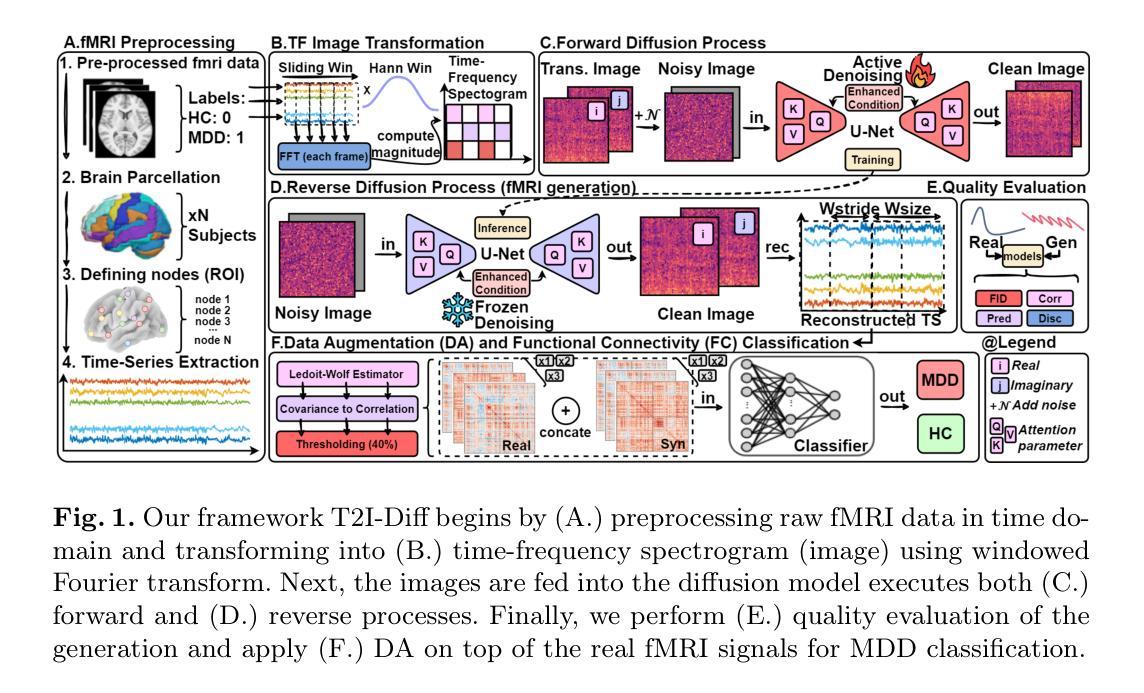 - T2I-Diff框架通过时间依赖的傅立叶变换将BOLD信号转换为分窗频谱图,以捕获基本的时间动态和频谱演变。