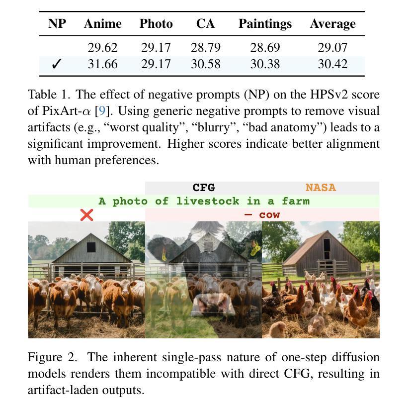 二、虽然负提示在多步模型中已被证明对精细控制有效,但其在一步生成器中的应用仍存在挑战,可能导致混合伪影和输出质量下降。