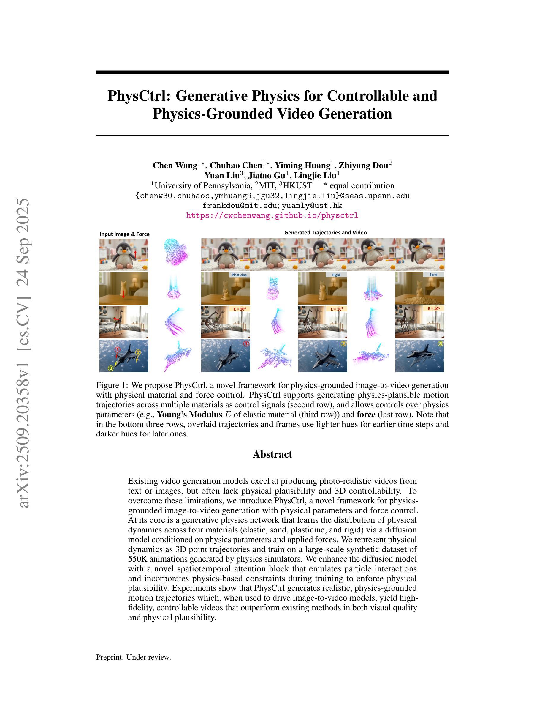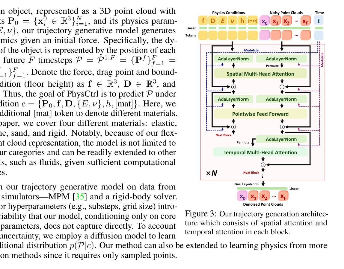 现有视频生成模型擅长从文本或图像生成逼真的视频,但往往缺乏物理可行性和3D可控性。为了克服这些限制,我们引入了PhysCtrl,这是一个新的基于物理的图像到视频生成框架,具有物理参数和力控制功能。其核心是一个生成物理网络,通过扩散模型学习四种材料(弹性、沙子、塑料和刚性)的物理动态分布,该模型根据物理参数和应用力进行条件控制。我们将物理动态表示为3D点轨迹,并在由物理模拟器生成的大规模合成数据集(55万个动画)上进行训练。我们增强扩散模型,增加了一种新型时空注意力块,该块模拟粒子交互并在训练期间加入基于物理的约束,以强制物理合理性。实验表明,PhysCtrl生成的物理基础运动轨迹现实,当用于驱动图像到视频模型时,可以生成高质量、可控的视频,在视觉质量和物理合理性方面均优于现有方法。项目页面:https://cwchenwang.github.io/physctrl