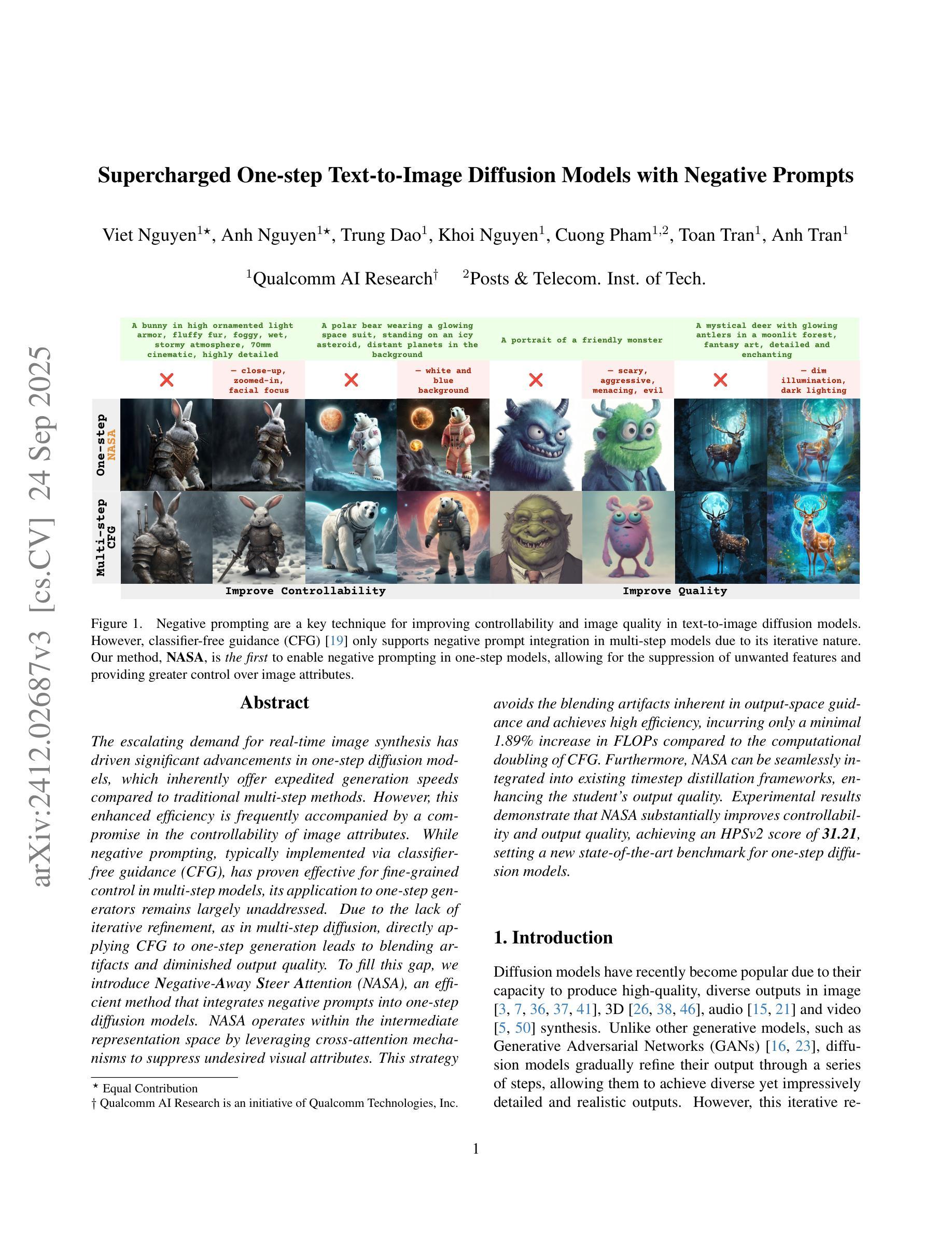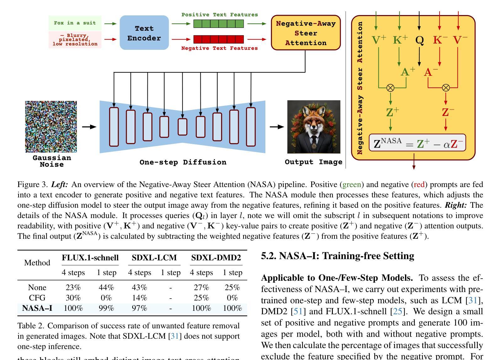 实时图像合成需求的不断升级推动了一步扩散模型的显著发展,该模型相较于传统多步方法提供了更快的生成速度。然而,这种提升的效率通常伴随着图像属性控制性的妥协。虽然负提示通过无分类引导(CFG)在多部模型中已实现精细控制,但其在一步生成器中的应用仍然基本未被解决。由于缺乏如多步扩散中的迭代优化,直接在一步生成中应用CFG会导致混合伪影和输出质量下降。为了填补这一空白,我们引入了负向注意力(NASA),这是一种将负提示整合到一步扩散模型中的高效方法。NASA通过在中间表示空间内利用交叉注意力机制来抑制不想要的视觉属性来工作。这种策略避免了输出空间指导的固有混合伪影,并且效率高,相较于计算翻倍的CFG只增加了额外的1.89%浮点运算量。此外,NASA可以无缝集成到现有的时间步蒸馏框架中,提高了学生模型的输出质量。实验结果表明,NASA在控制性和输出质量上取得了显著的提升,实现了HPSv2评分31.21的新里程碑成绩,为一步扩散模型创造了新的先进基准。