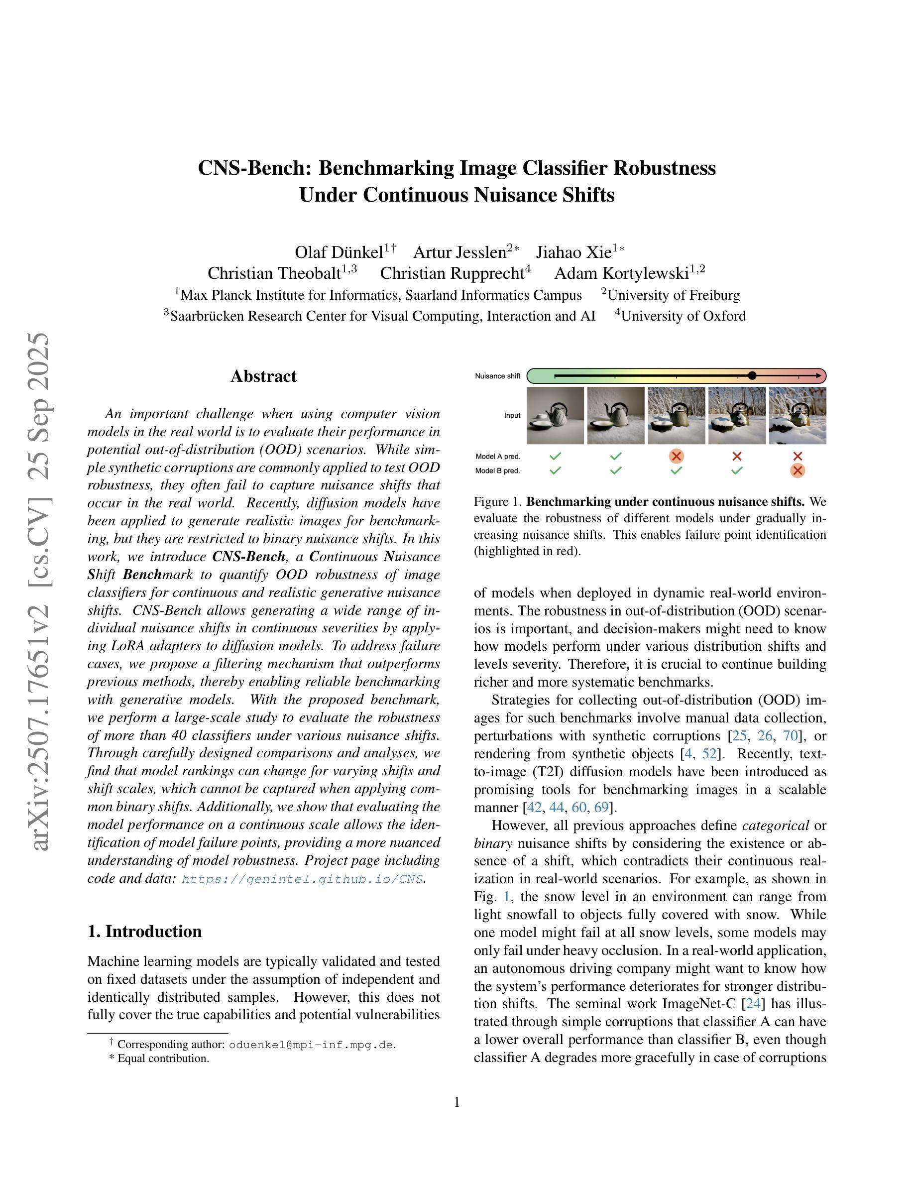 本文介绍了一个名为CNS-Bench的新连续干扰移位基准测试,用于衡量图像分类器在连续且现实的生成干扰移位场景中的稳健性。该基准测试通过应用LoRA适配器到扩散模型来生成各种个人干扰移位,并引入了一种过滤机制来解决失败情况,从而实现了可靠的基准测试。大规模研究显示,在不同的干扰移位和移位尺度下,模型排名可能会发生变化,而常见的二元移位无法捕捉到这一点。评估模型性能的连续性有助于发现模型的失败点,提供更深入的模型稳健性理解。