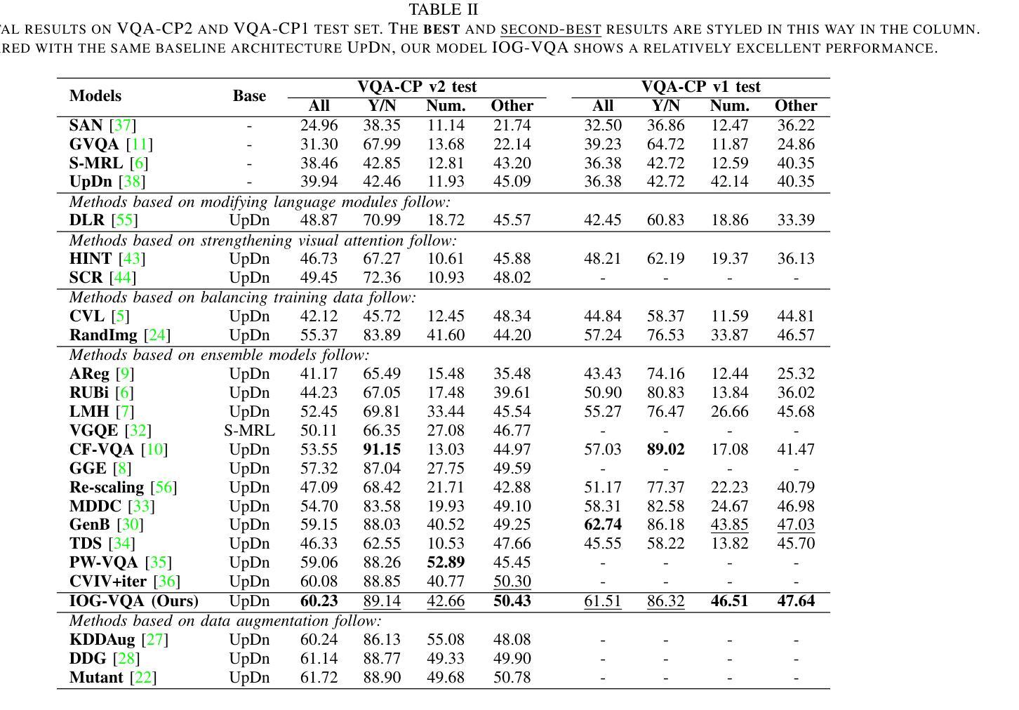 - IOG-VQA模型在VQA-CP v1和VQA-CP v2数据集上表现出卓越性能。
