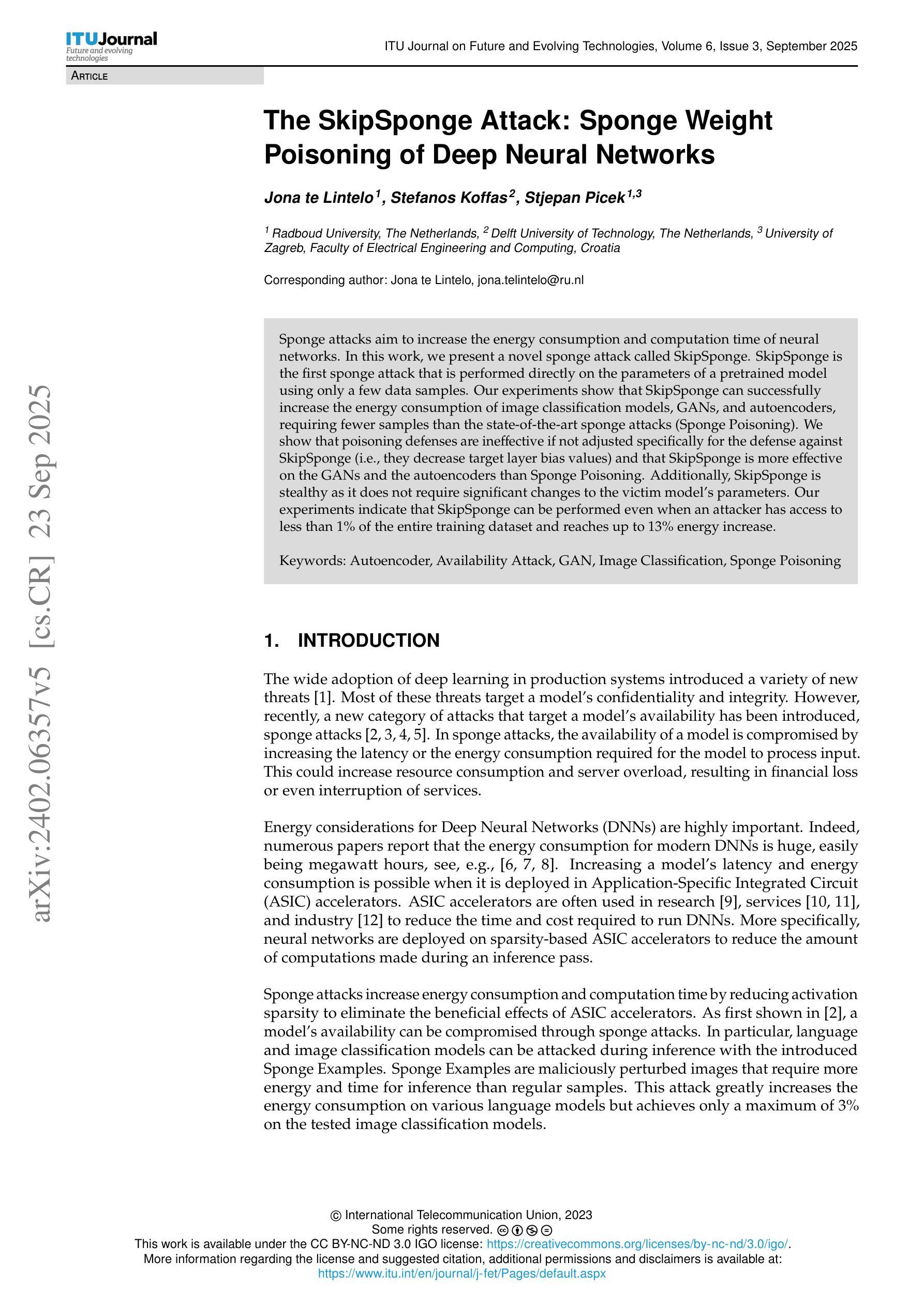 海绵攻击旨在增加神经网络的能耗和计算时间。在这项工作中,我们提出了一种新型的海绵攻击,称为SkipSponge。SkipSponge是首个直接在预训练模型的参数上使用的海绵攻击,并且仅使用少量数据样本即可。我们的实验表明,SkipSponge能够成功增加图像分类模型、生成对抗网络(GAN)和自动编码器的能耗,并且相较于现有的海绵攻击(海绵中毒)需要更少的样本。我们展示了如果不针对SkipSponge进行特定的调整(即降低目标层偏见值),那么中毒防御是无效的,并且SkipSponge在GAN和自动编码器上的效果比海绵中毒更为有效。此外,SkipSponge很隐蔽,因为它不需要对目标模型的参数进行重大更改。我们的实验表明,即使在攻击者只能访问整个训练数据集的不到1%的情况下,SkipSponge也可以实施,并且能够达到高达13%的能耗增加。