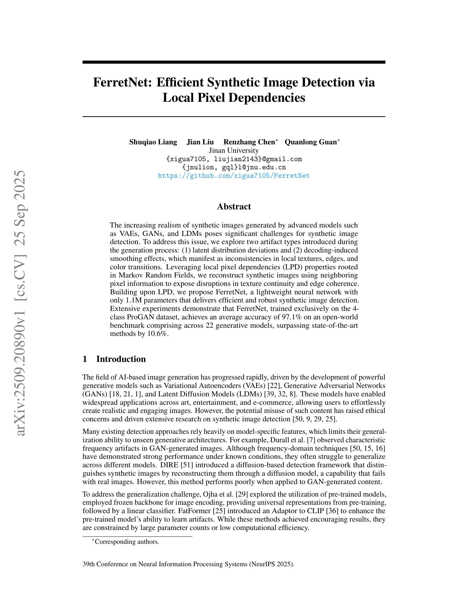 高级模型如VAEs、GANs和LDMs生成的合成图像越来越逼真,给合成图像检测带来挑战。研究通过生成过程中的潜在分布偏差和解码引起的平滑效应这两种人工制品,利用基于马尔可夫随机场的局部像素依赖性(LPD)属性,通过邻近像素信息重建合成图像,以暴露纹理连续性和边缘一致性的中断。在此基础上,提出轻量级神经网络FerretNet,仅有110万参数,能高效、稳健地检测合成图像。在由22种生成模型组成的开放世界基准测试中,仅对ProGAN数据集进行训练的FerretNet平均准确度达到97.1%,比现有技术高出10.6%。