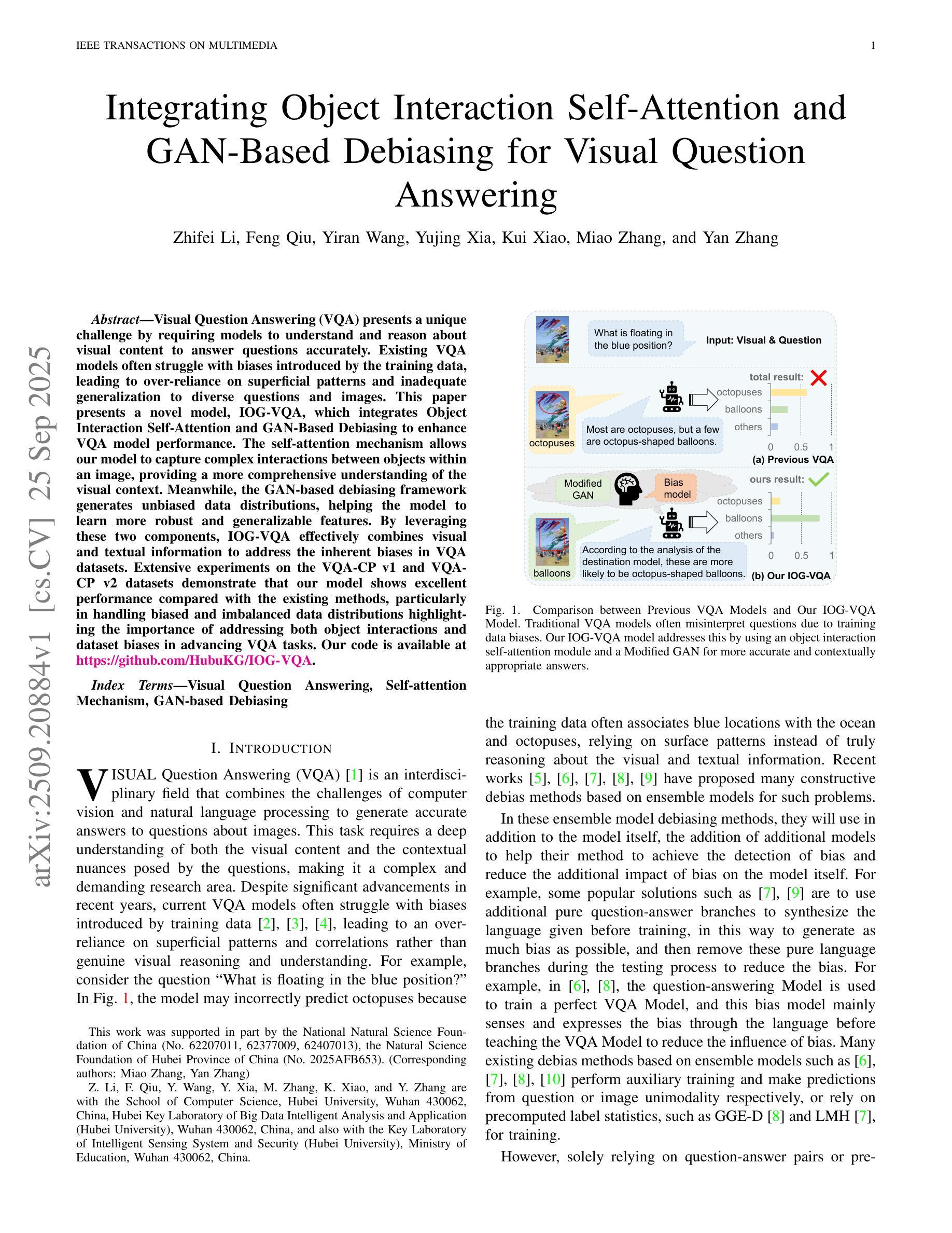 视觉问答(VQA)要求模型理解和推理视觉内容以准确回答问题,存在独特的挑战。现有VQA模型常受训练数据引入的偏见影响,过于依赖表面模式,对多样化和不同的问题和图像泛化不足。本文提出一种新型模型IOG-VQA,集成对象交互自注意力机制和基于GAN的去偏技术,提高VQA模型性能。自注意力机制使模型能捕捉图像内对象间的复杂交互,更全面地理解视觉上下文。同时,基于GAN的去偏框架生成无偏见的数据分布,帮助模型学习更稳健和可泛化的特征。通过利用这两个组件,IOG-VQA有效地结合视觉和文本信息,解决VQA数据集固有的偏见问题。在VQA-CP v1和VQA-CP v2数据集上的广泛实验表明,与现有方法相比,该模型表现出卓越的性能,特别是在处理有偏见和不平衡的数据分布时。