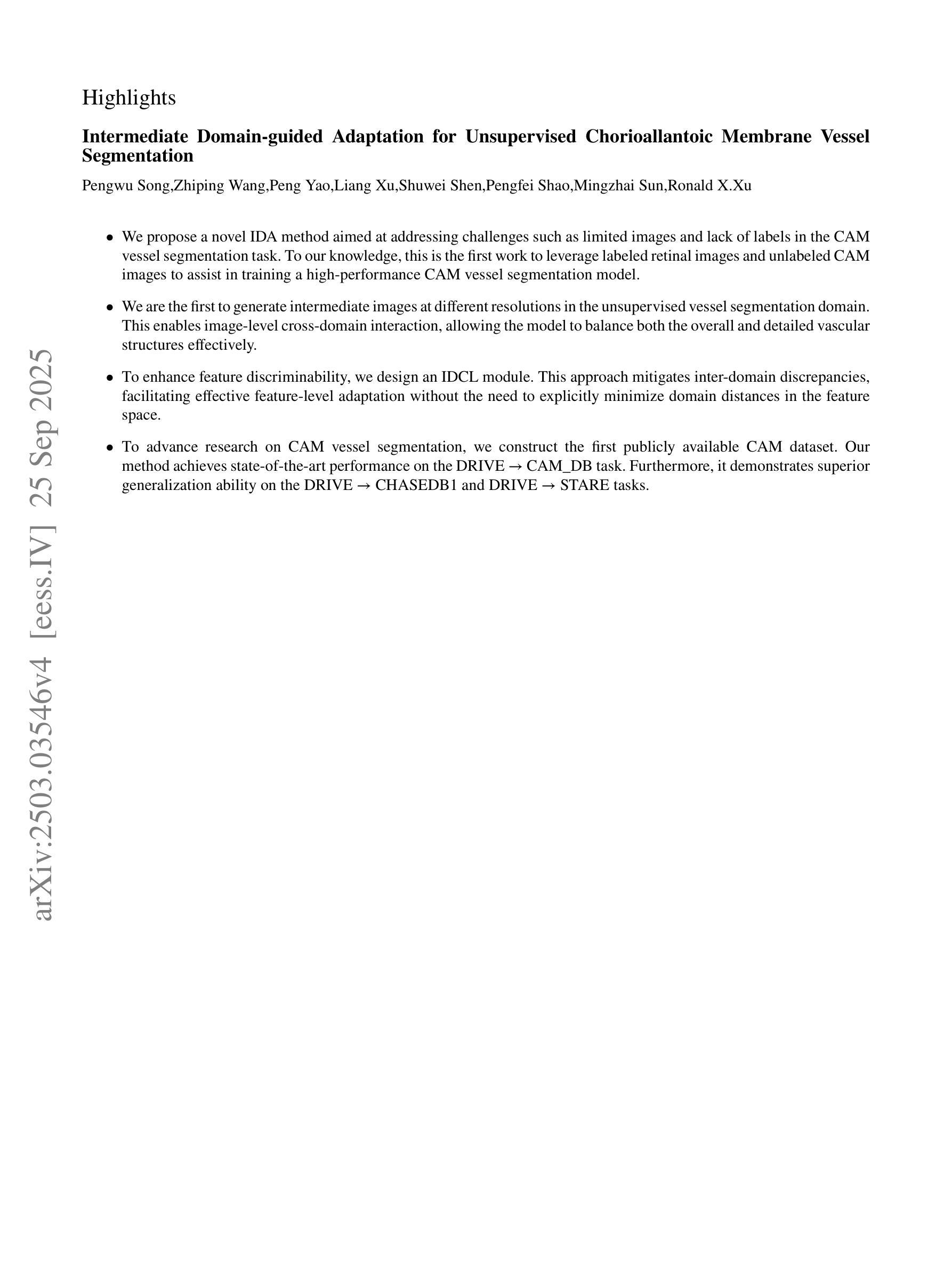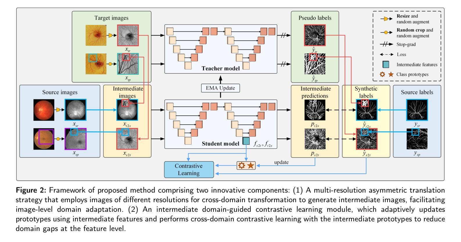 利用中间域引导适应(IDA)方法解决鸡胚绒毛膜尿膜(CAM)血管模型图像分割难题。通过借鉴视网膜图像与CAM图像的相似性,利用现有公共视网膜数据集进行CAM图像的无监督训练。采用多分辨率对称翻译(MRAT)策略生成中间图像,促进图像级别的交互。开发中间域引导对比学习(IDCL)模块,以解开跨域特征表示。创建首个CAM数据集验证算法,表现优异,且在不同视网膜数据集上的无监督迁移任务中展现出强大的泛化能力。