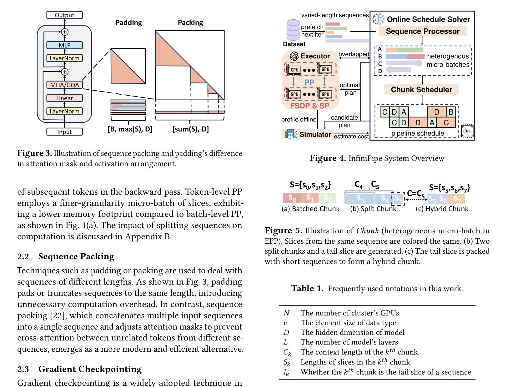 大型语言模型(LLM)需要上下文长期训练以增强效果。现有的并行处理策略如序列并行处理会引入巨大的通信开销。管道并行(PP)降低了这一成本,但其有效性取决于分区粒度选择。批级别PP在具有长上下文的情况下表现出高内存消耗,而基于token的PP通过将序列切片来缓解内存开销,但可能导致硬件利用率不足。本文提出了一种自适应选择PP粒度的方法以适应资源和工作负载特性。此外,现实世界数据集序列长度分布的不平衡性对PP的工作负载平衡和调度效率提出了挑战。当前静态PP调度方法忽略了序列长度的变化,导致性能不佳。本文提出了弹性管道并行性(EPP),通过组合基于token的PP和批级别PP来适应资源和工作负载的异质性。构建了一个分布式训练系统InfiniPipe,通过资源感知和工作负载平衡序列处理器来应对长序列并打包短序列;采用阶段感知块级自适应检查点策略进行联合优化管道调度和梯度检查点优化策略的方式解决该挑战。实验证明,InfiniPipe相较于现有系统取得了高达1.69倍的速度提升。