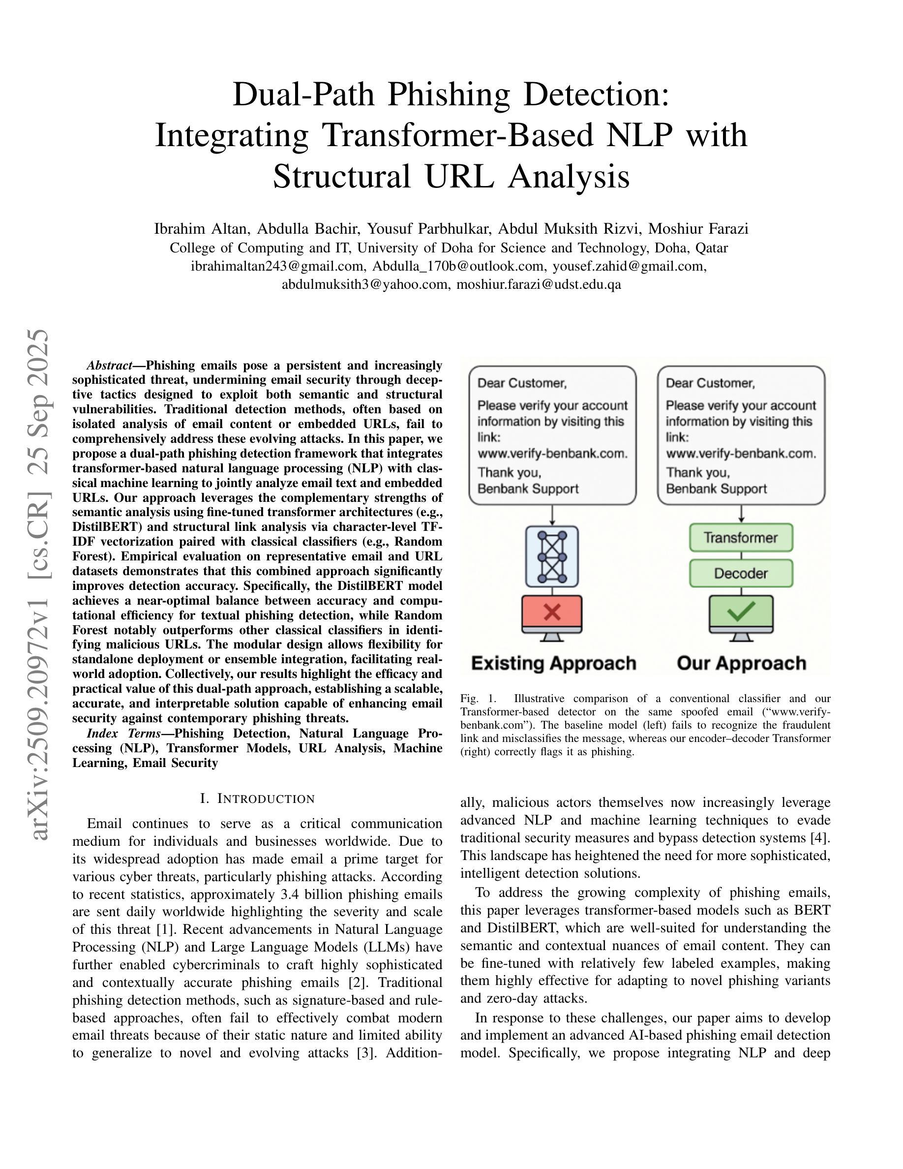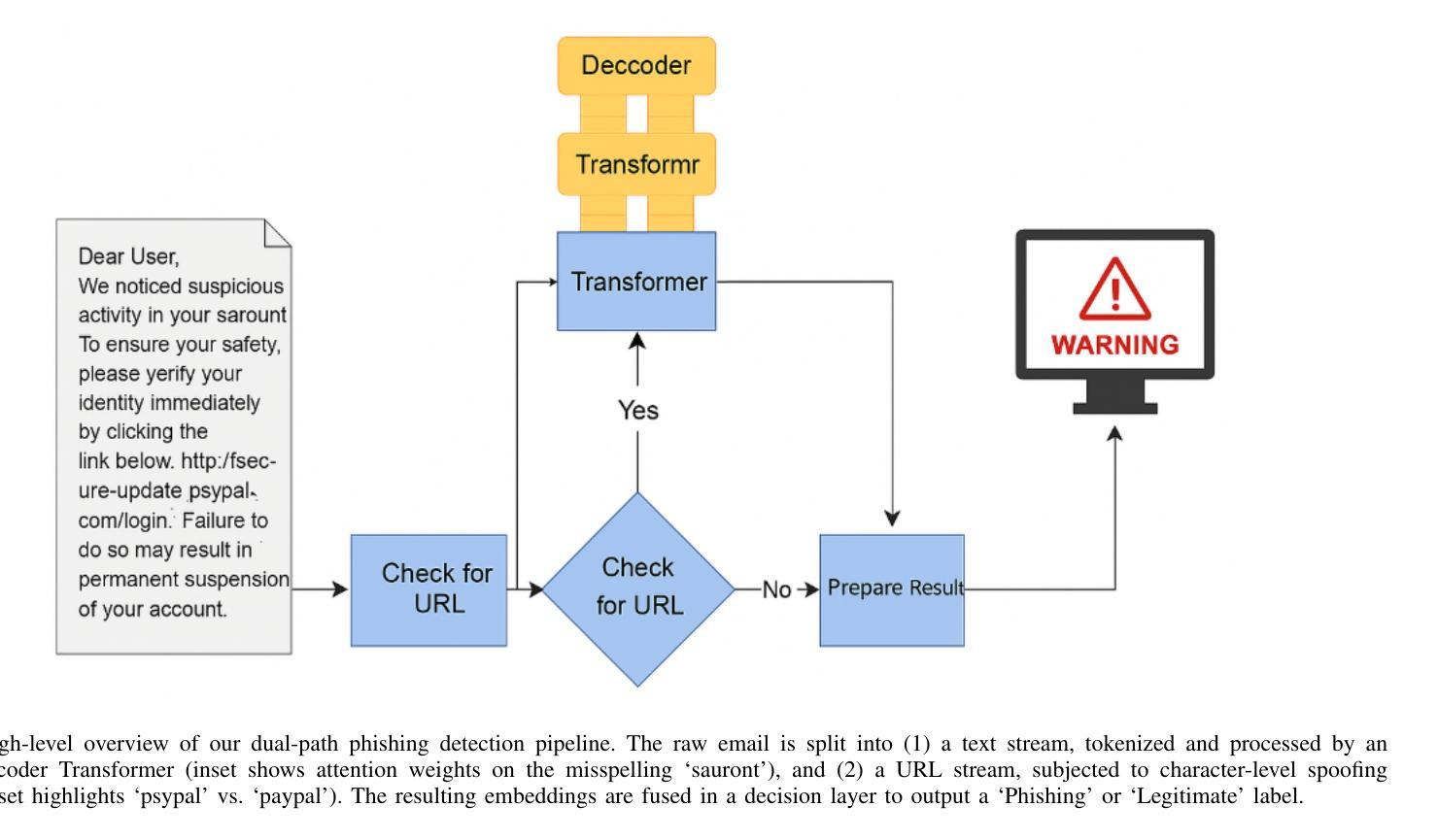 Summary:钓鱼邮件持续构成威胁,且手段日益狡猾,通过语义和结构上的漏洞进行欺骗性攻击,削弱电子邮件的安全性。传统检测方式往往局限于邮件内容或嵌入链接的单独分析,难以应对日益复杂的攻击。本文提出了一种双路径钓鱼邮件检测框架,融合了基于转换器的自然语言处理(NLP)和经典机器学习技术,同时分析邮件文本和嵌入链接。该方法结合了微调转换器架构(如DistilBERT)的语义分析和基于字符级别的TF-IDF向量化的结构链接分析,配合经典分类器(如随机森林)。在具有代表性的电子邮件和URL数据集上的实证评估表明,该组合方法显著提高了检测精度。具体来说,DistilBERT模型在准确率和计算效率之间实现了近乎最优的平衡,而随机森林在识别恶意URL方面表现尤为出色。本设计具有模块化特点,可灵活部署或集成,具有实际应用价值。总体而言,本研究结果突显了双路径方法的效能和实用性,建立了一种可扩展、准确且可解释的解决方案,可增强电子邮件对现代钓鱼威胁的安全性。