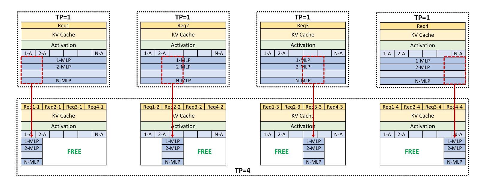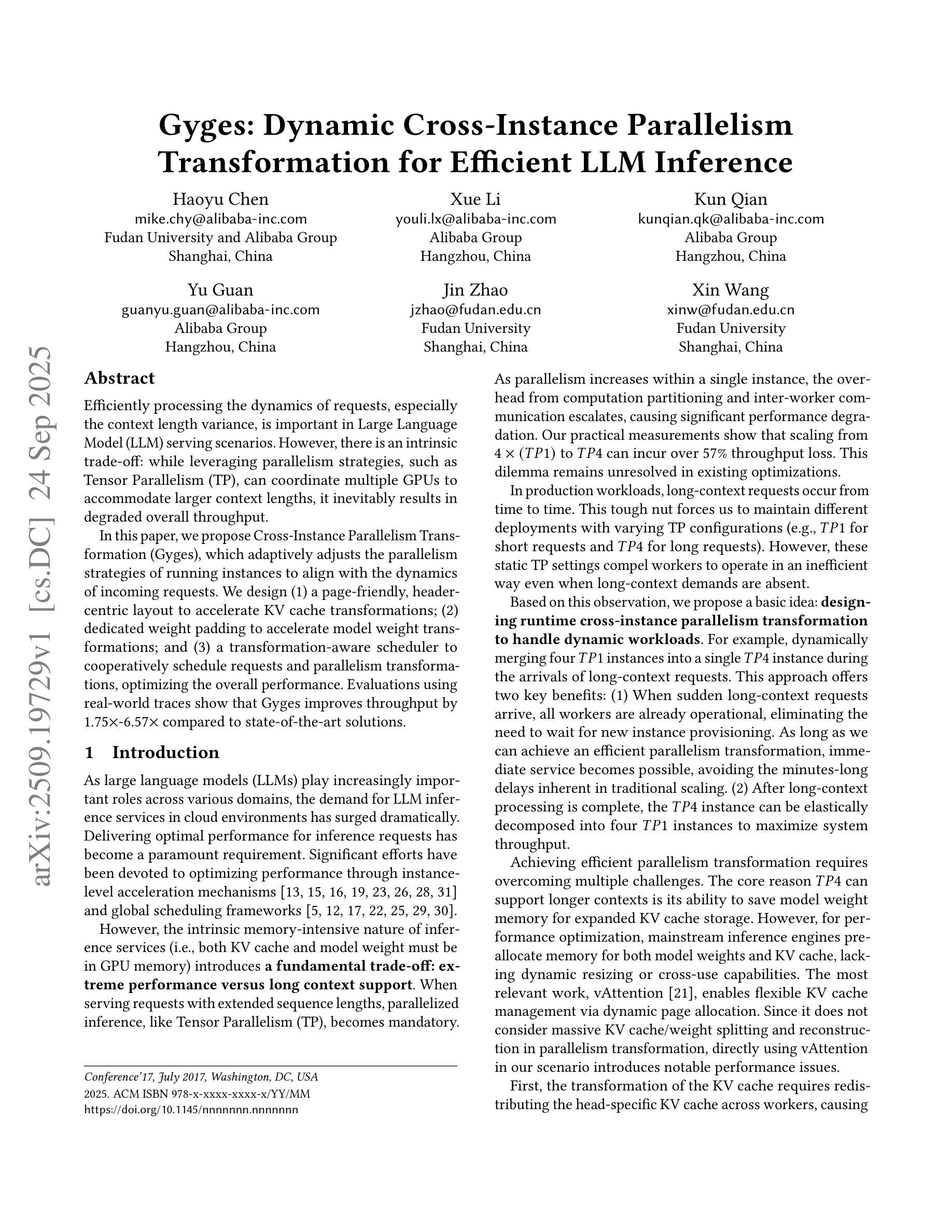 在大语言模型(LLM)服务场景中,高效处理请求的动态变化,尤其是上下文长度变化是非常重要的。然而,存在一个固有的权衡:虽然利用并行性策略(如张量并行性)可以协调多个GPU以适应更大的上下文长度,但不可避免地会导致总体吞吐量下降。在本文中,我们提出了跨实例并行性转换(Gyges),它自适应地调整运行实例的并行性策略,以匹配传入请求的动态变化。我们设计了(1)一种友好的、以页眉为中心的布局来加速键值缓存转换;(2)专用的权重填充来加速模型权重转换;(3)一个感知转换的调度器,以协同调度请求和并行转换,从而优化整体性能。使用真实世界痕迹的评估表明,与最先进的解决方案相比,Gyges提高了1.75倍至6.57倍的吞吐量。