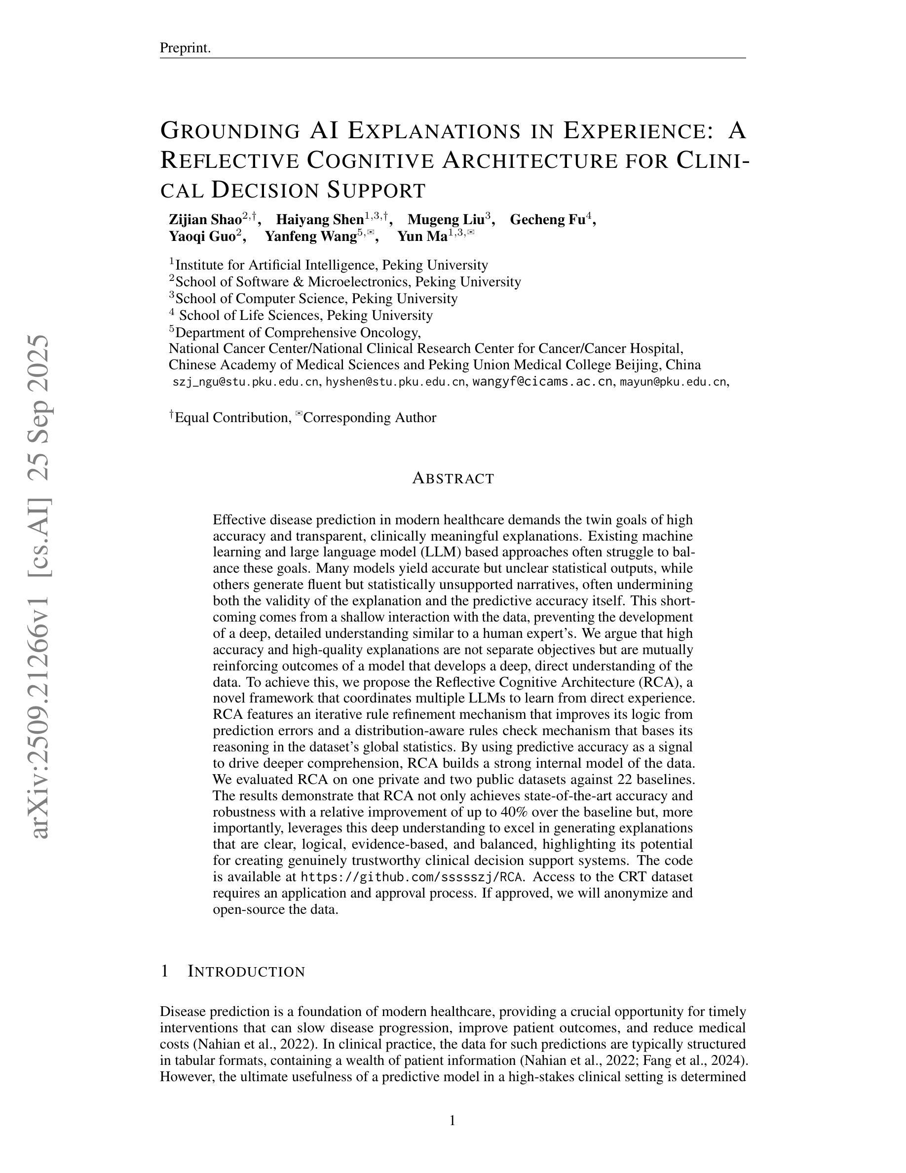 在现代医疗中,有效的疾病预测需要同时实现高准确性和透明、临床意义的解释这两个目标。现有的基于机器学习和大型语言模型(LLM)的方法往往很难平衡这两个目标。许多模型产生的结果准确但解释不清晰,而另一些模型则生成了流畅但缺乏统计支持的叙述,这既破坏了解释的合理性,也影响了预测的准确性。这种缺点来自于与数据的浅层交互,阻碍了类似于人类专家那样深入、详细的理解的发展。我们认为,高准确性和高质量的解释不是独立的目标,而是相互促进的结果,一个模型通过对数据有深入、直接的理解而得出的结果。为了实现这一点,我们提出了反思认知架构(RCA),这是一个协调多个LLM从直接经验中学习的新型框架。RCA具有迭代规则优化机制,通过预测误差改进逻辑,以及基于数据全局统计的分布式规则检查机制。它以预测准确性作为驱动更深层次理解的信号,建立强大的内部数据模型。我们在一个私有数据集和两个公共数据集上对RCA进行了评估,并与22个基线方法进行了比较。结果表明,RCA不仅实现了最先进的准确性和稳健性,相对于基线方法有着高达40%的相对改进,更重要的是,它利用这种深入的理解在生成清晰、逻辑性强、基于证据和平衡的解释方面表现出色,突显其在创建真正可信的临床决策支持系统方面的潜力。代码可在https://github.com/ssssszj/RCA获取。