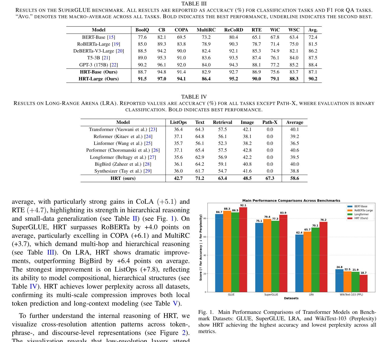 - HRT在多个基准测试中表现出卓越性能,包括GLUE、SuperGLUE、Long Range Arena和WikiText-103等任务。