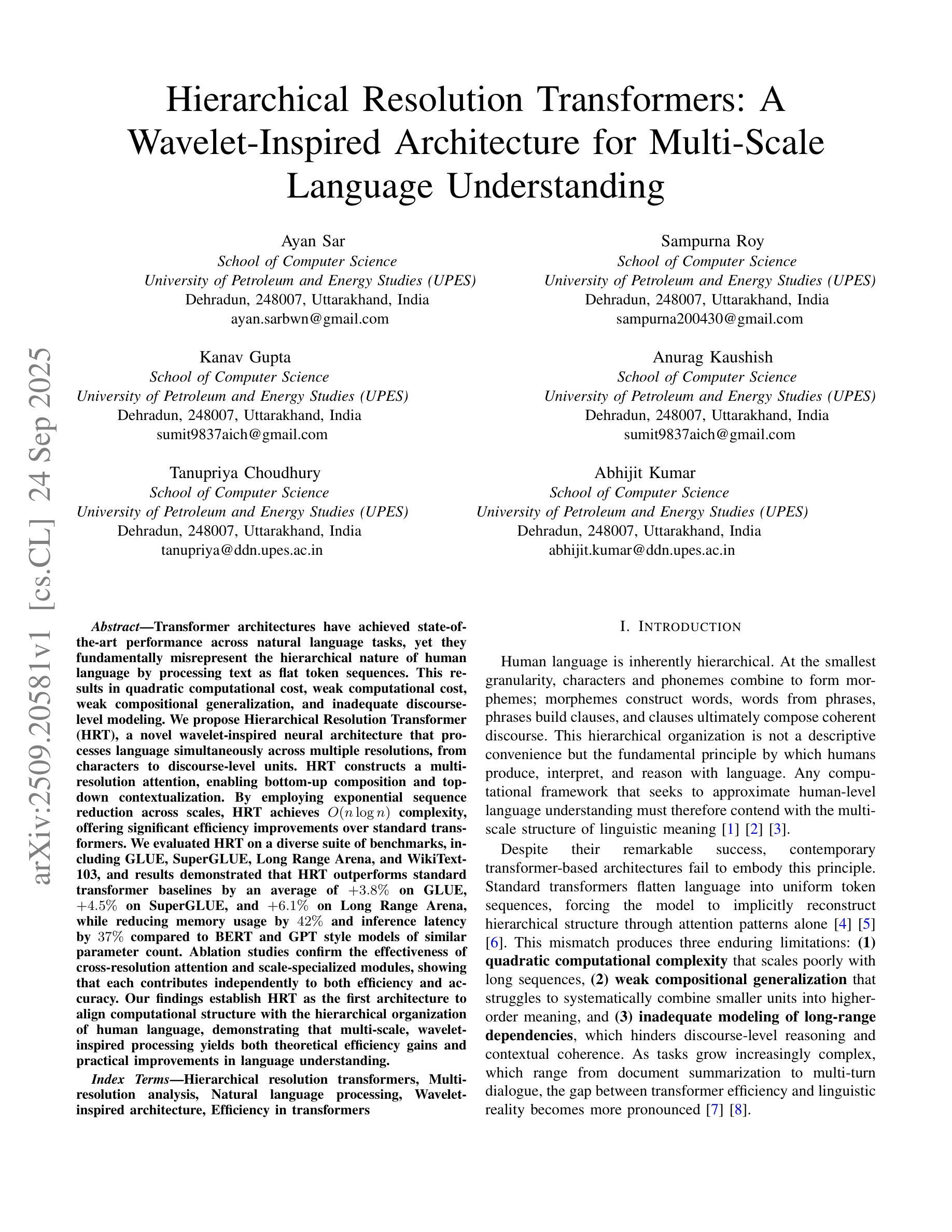 Transformer架构在自然语言任务上取得了最先进的性能,但它们通过处理扁平的令牌序列来根本性地误代表人类语言的层次结构。这导致了二次方的计算成本、较弱的计算成本和不足的语境建模。我们提出了分层解析Transformer(HRT),这是一种受小波启发的新型神经网络架构,能够同时处理多个分辨率的语言,从字符到语境级单位。HRT构建了多分辨率注意力机制,实现了自下而上的组合和自上而下的语境化。通过采用跨尺度的指数序列缩减,HRT实现了O(nlogn)的复杂度,相较于标准Transformer有着显著的效率提升。我们在GLUE、SuperGLUE、Long Range Arena和WikiText-103等多种基准测试集上评估了HRT,结果表明,HRT在GLUE上的平均性能较标准Transformer基线提高了+3.8%,在SuperGLUE上提高了+4.5%,在Long Range Arena上提高了+6.1%,同时相较于类似参数数量的BERT和GPT风格模型,内存使用率降低了42%,推理延迟降低了37%。消融研究证实了跨分辨率注意力和尺度专业化模块的有效性,表明它们各自对效率和准确性都有独立的贡献。我们的研究确立了HRT作为首个将计算结构与人类语言的层次结构相匹配的架构,证明了多尺度、受小波启发的处理既带来了理论上的效率提升,也在语言理解方面取得了实际的改进。
