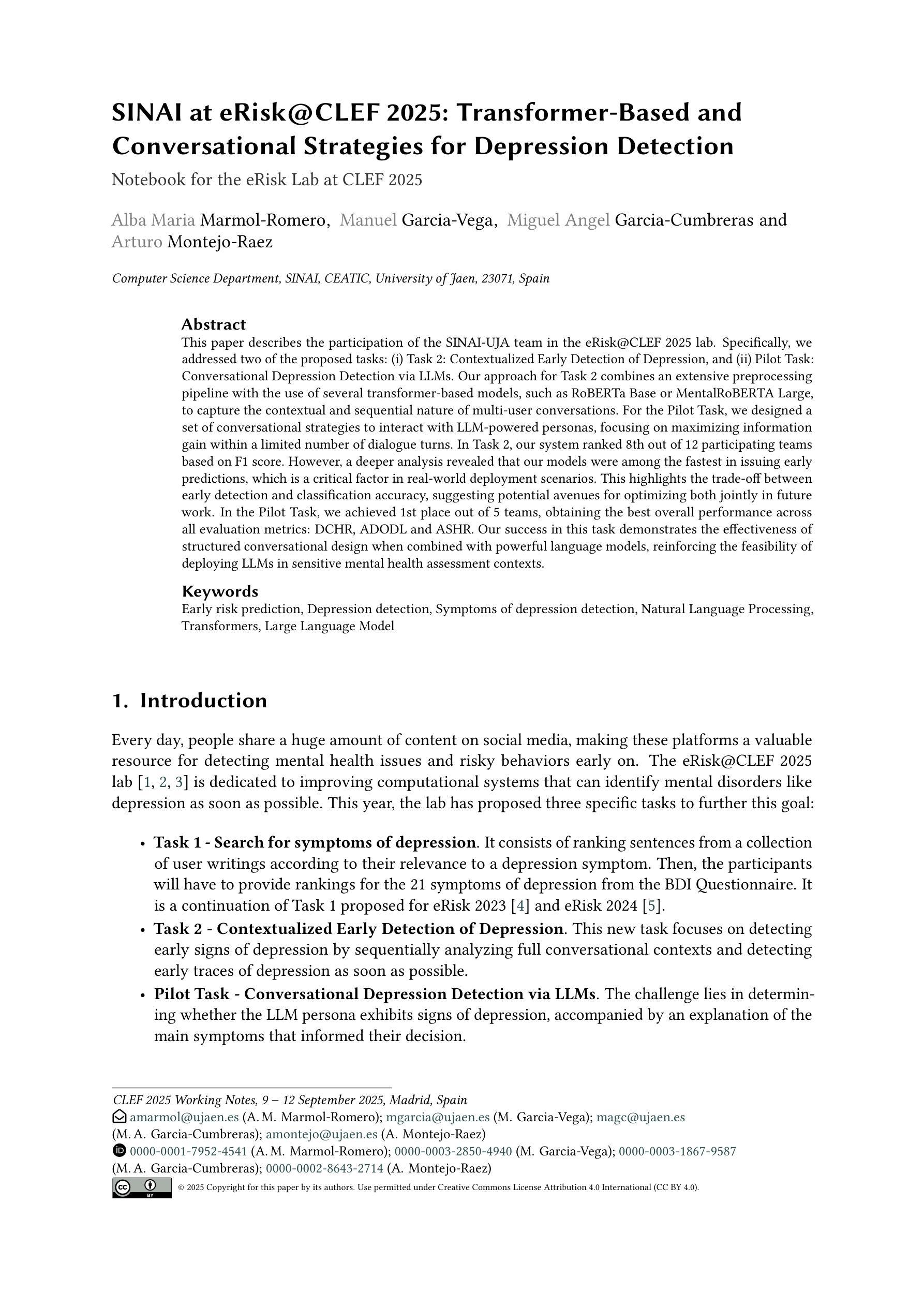 本文描述了SINAI-UJA团队参与eRisk@CLEF 2025实验室的情况。具体来说,我们解决了两个提出的任务:(i)任务2:上下文早期抑郁症检测,以及(ii)试点任务:通过LLM进行对话式抑郁症检测。我们在任务2中的方法结合了广泛的预处理流程,以及使用多个基于transformer的模型,如RoBERTa Base或MentalRoBERTA Large,以捕捉多用户对话的上下文和顺序特性。对于试点任务,我们设计了一套对话策略与LLM驱动的角色进行交互,侧重于在有限的对话回合内最大化信息获取。在任务2中,我们的系统在F1分数上排名第8,共有12支参赛队伍。然而,深入分析表明,我们的模型在提供早期预测方面速度最快,这在现实部署场景中是一个关键因素。这突出了早期检测与分类准确性之间的权衡,为未来工作中可能同时优化这两者提供了潜在途径。在试点任务中,我们在5支队伍中排名第一,在所有评估指标上获得最佳整体表现:DCHR、ADODL和ASHR。我们在这一任务中的成功展示了结构化对话设计与强大的语言模型相结合的有效性,进一步证明了在敏感的精神健康评估环境中部署LLM的可行性。