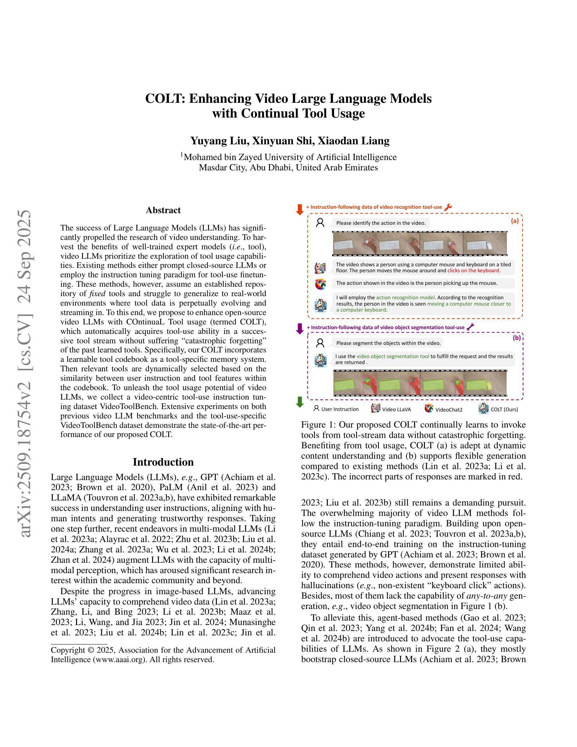 大型语言模型(LLM)的成功推动了视频理解研究的进展。为了利用预训练模型的优势,视频LLM重点探索工具使用能力。现有方法通过提示闭源LLM或采用指令微调模式进行工具使用微调。然而,这些方法假定存在固定的工具库,难以泛化到现实环境中不断演变和流动的工具数据。为此,我们提出增强开源视频LLM的连续工具使用(COLT)能力,可自动在连续工具流中获取工具使用能力,而不会遗忘过去学习的工具。COLT采用可学习的工具代码本作为工具特定记忆系统,并根据用户指令与代码本中工具特征的相似性动态选择相关工具。为了释放视频LLM的工具使用潜力,我们收集了以视频为中心的工具使用指令调整数据集VideoToolBench。在之前的视频LLM基准测试和专用的VideoToolBench数据集上的实验表明,COLT具有卓越性能。