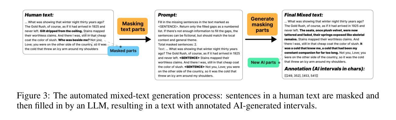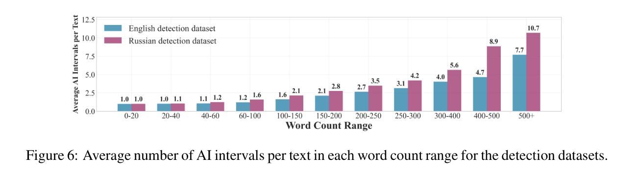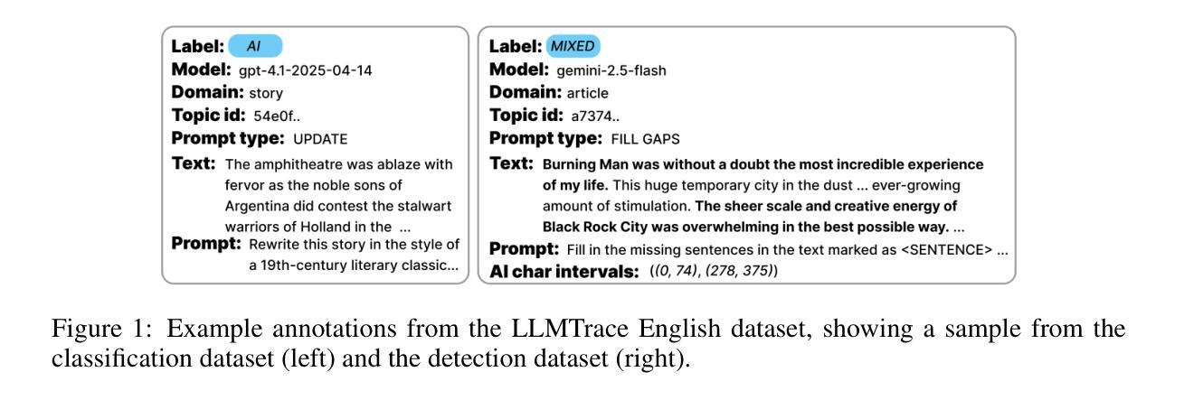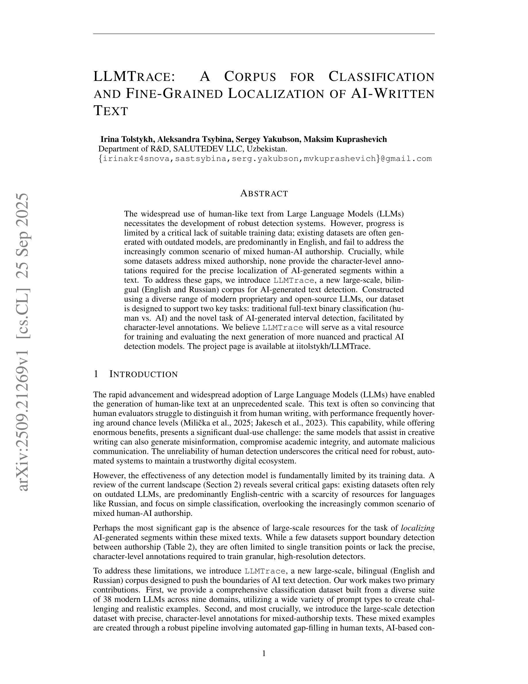 由大型语言模型(LLM)产生的人形文本广泛应用,这促使需要开发稳健的检测系统。然而,由于缺少合适的训练数据,进展受到限制;现有数据集通常由过时模型生成,主要为英语,并且未能解决日益普遍的人机混合创作场景。虽然一些数据集解决了混合创作问题,但没有数据集提供字符级别的注释,无法准确定位文本中AI生成的片段位置。为了解决这些空白,我们引入了LLMTrace,这是一个新的大规模双语(英语和俄语)语料库,用于检测AI生成的文本。通过使用各种现代专有和开源LLM构建,我们的数据集旨在支持两项关键任务:传统的全文二进制分类(人类与AI)和新的AI生成间隔检测任务,后者由字符级注释促进。我们相信LLMTrace将成为培训和评估下一代更微妙、更实用的AI检测模型的重要资源。项目页面可通过链接iitolstykh/LLMTrace(https://sweetdream779.github.io/LLMTrace-info/)访问。