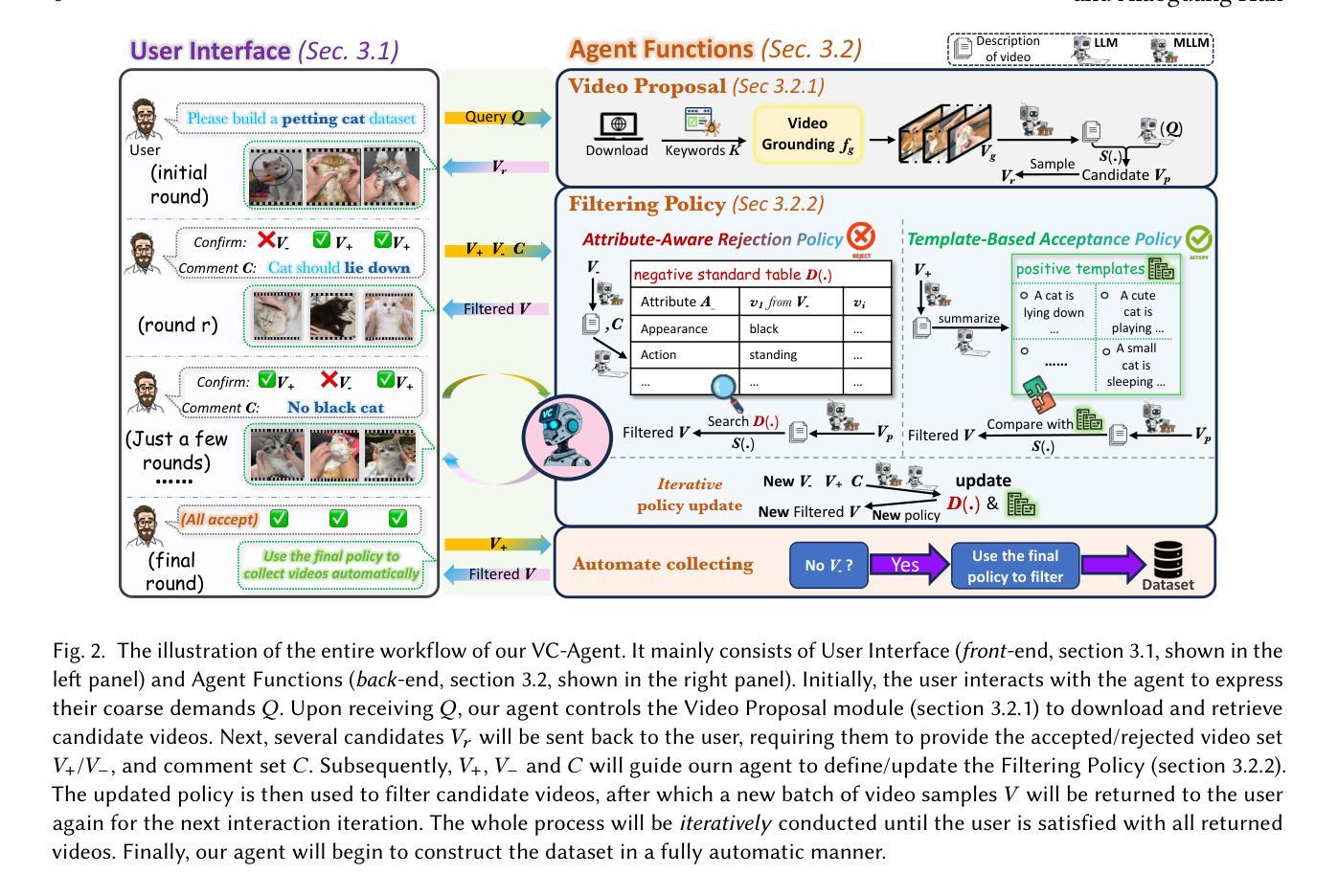 Facing scaling laws, video data from the internet becomes increasingly important. However, collecting extensive videos that meet specific needs is extremely labor-intensive and time-consuming. In this work, we study the way to expedite this collection process and propose VC-Agent, the first interactive agent that is able to understand users’ queries and feedback, and accordingly retrieve/scale up relevant video clips with minimal user input. Specifically, considering the user interface, our agent defines various user-friendly ways for the user to specify requirements based on textual descriptions and confirmations. As for agent functions, we leverage existing multi-modal large language models to connect the user’s requirements with the video content. More importantly, we propose two novel filtering policies that can be updated when user interaction is continually performed. Finally, we provide a new benchmark for personalized video dataset collection, and carefully conduct the user study to verify our agent’s usage in various real scenarios. Extensive experiments demonstrate the effectiveness and efficiency of our agent for customized video dataset collection. Project page: https://allenyidan.github.io/vcagent_page/.