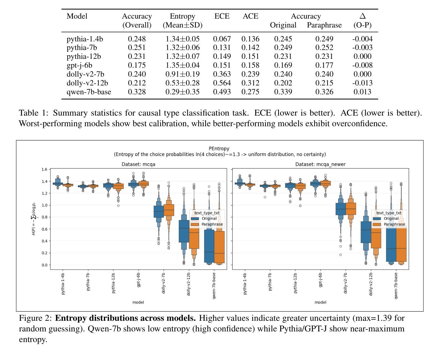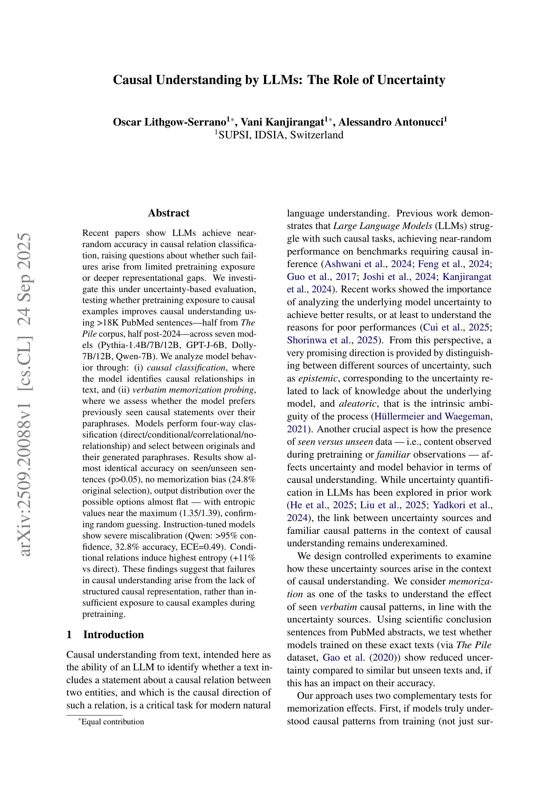 本文探讨了大型语言模型(LLM)在因果关联分类中达到近似随机准确性的问题,质疑是否源于预训练暴露的有限性或更深层次的表征差距。通过不确定性评估方法,研究了预训练期间接触因果示例是否有助于改善模型的因果理解。研究结果指出,模型在已见和未见句子上的准确率几乎相同,无记忆偏见,且输出分布接近平坦,最大熵值接近,表明模型表现接近随机猜测。指令微调模型存在严重校准失误。这些发现暗示,因果理解的失败源于缺乏结构化因果表征,而非预训练期间接触到的因果示例不足。