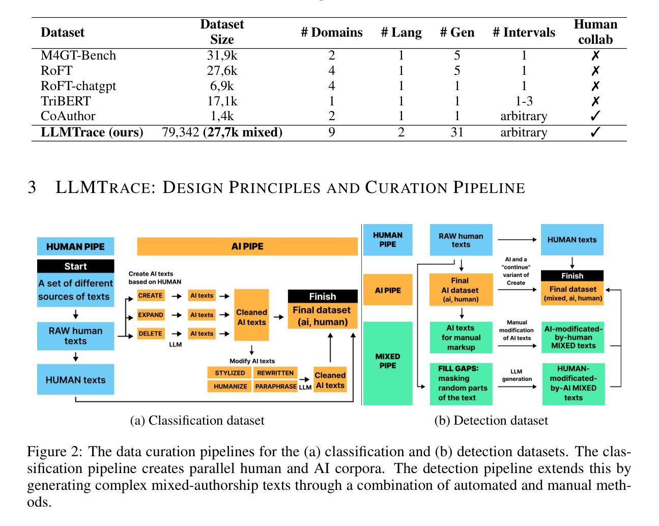 人工智能生成文本广泛使用,对大语言模型(LLM)的检测系统提出了更高的要求。当前训练数据存在不足,需要开发新的数据集。LLMTrace是一个大规模双语(英语和俄语)语料库,用于检测AI生成的文本。该数据集支持传统全文二元分类(人类与AI)和新任务AI生成间隔检测,通过字符级注释实现。LLMTrace将成为训练和评估下一代更精细、更实用的AI检测模型的重要资源。