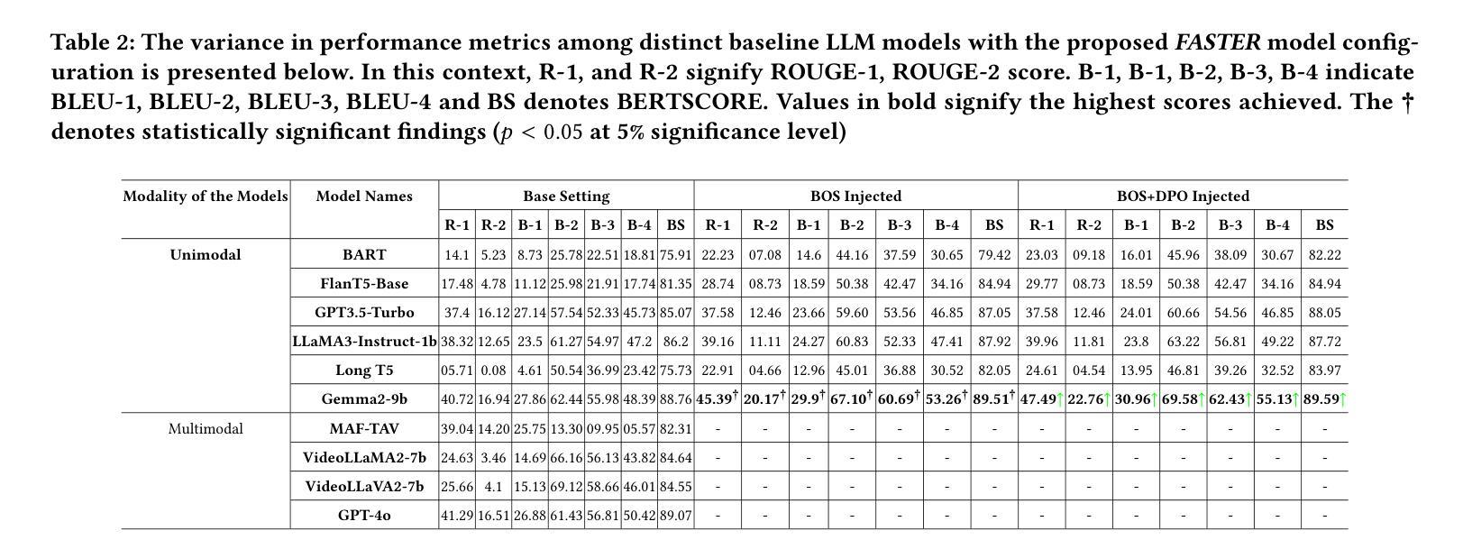 社交媒体动态的传播方式通过播客视频扩大了金融咨询内容的覆盖范围,但从长达30-40分钟的多媒体片段中提取见解仍然具有挑战性。我们推出了FASTER(带文本嵌入相关图像的金融咨询摘要器),这是一个模块化框架,解决了三个关键挑战:(1)提取特定模态的特征,(2)生成优化、简洁的摘要,(3)将视觉关键帧与相关的文本点对齐。FASTER采用BLIP进行语义视觉描述、OCR进行文本模式识别,以及基于Whisper的转录和说话者分档作为BOS特征。一个经过修改的基于直接偏好优化(DPO)的损失函数,配备了BOS特定的事实核查,确保了与人类对齐摘要的精确性、相关性和事实一致性。基于排名的检索机制进一步将关键帧与摘要内容对齐,提高了可解释性和跨模态一致性。为了应对数据资源稀缺的问题,我们推出了Fin-APT数据集,该数据集包含470个可公开访问的金融咨询演讲视频,用于稳健的多模态研究。与大型语言模型(LLM)和视觉语言模型(VLM)相比,全面的跨域实验证实了FASTER在性能、稳健性和通用性方面的优势。通过建立多模态摘要的新标准,FASTER使金融咨询内容更容易获取和操作,从而为研究开辟了新途径。数据集和代码可在以下网址找到:https://github.com/sarmistha-D/FASTER