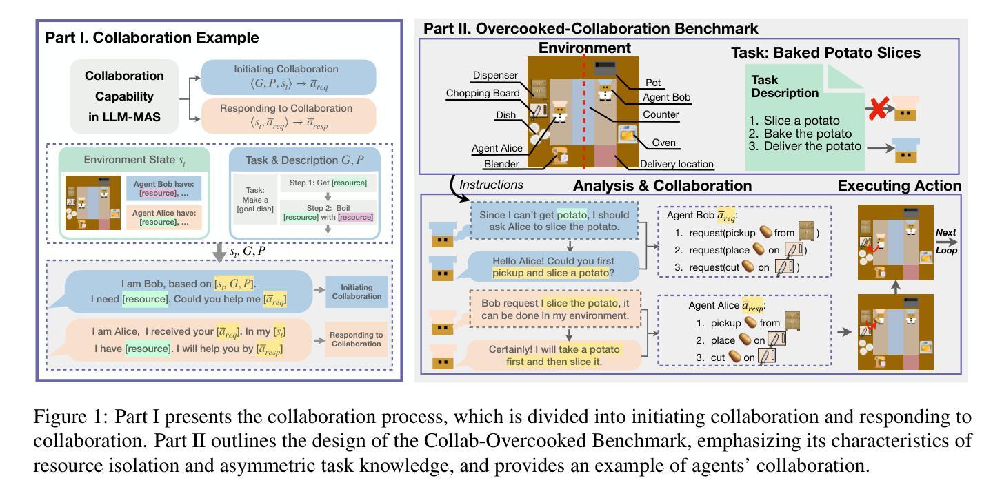 基于大语言模型(LLM)的代理系统在传统NLP任务之外的现实世界应用中已经取得了巨大的进步。本文提出了一个新的基于LLM的多代理系统(LLM-MAS)基准测试,名为Collab-Overcooked,它建立在流行的Overcooked-AI游戏之上,拥有更多适用于交互式环境中的挑战性任务。Collab-Overcooked以两种新颖的方式扩展了现有基准测试。首先,它提供了一个多代理框架,支持各种任务和目标,并通过自然语言通信鼓励协作。其次,它引入了一系列面向过程的评估指标,以评估不同LLM代理的精细协作能力,这是以前工作中经常被忽视的一个维度。我们对1. 我们对十三种流行的LLM进行了大量实验,发现虽然LLM在目标解读方面表现出很强的能力,但在主动协作和持续适应方面存在明显不足,这对于高效完成复杂任务至关重要。值得注意的是,我们强调了LLM-MAS的优势和不足,并提供了一个统一和开源基准测试的见解来改善和评估LLM-MAS。环境、30个开放任务和评估包可在https://github.com/YusaeMeow/Collab-Overcooked上公开访问。