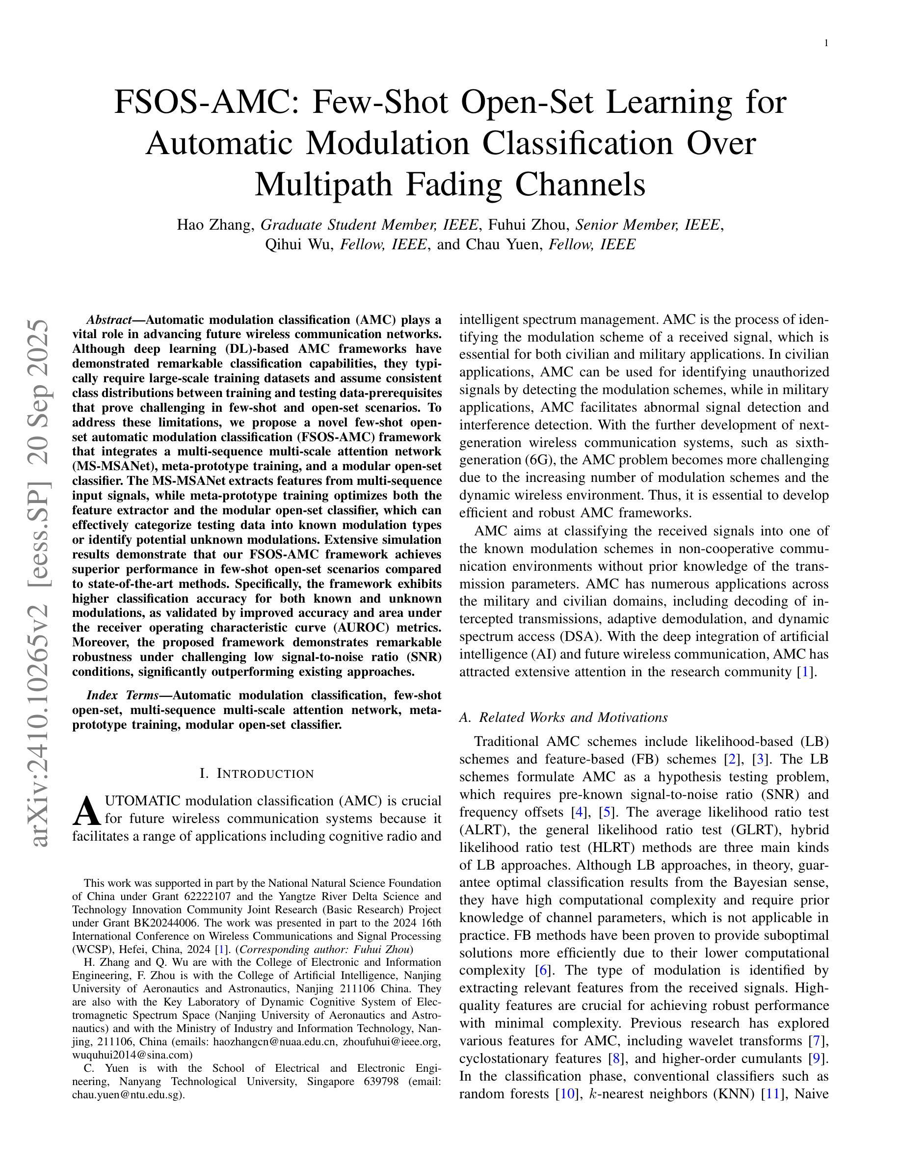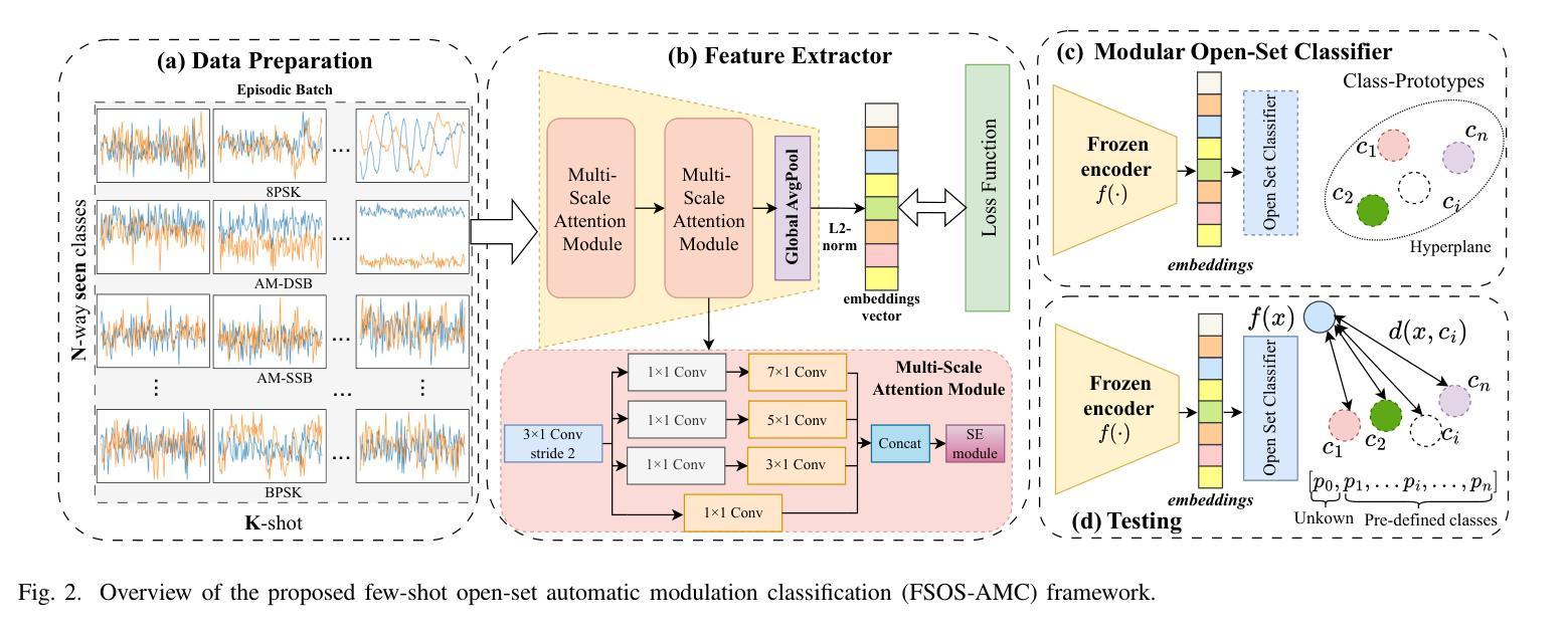 自动调制分类(AMC)在推动未来无线通信网络发展方面发挥着重要作用。尽管基于深度学习的AMC框架已表现出卓越的分类能力,但它们通常需要大规模的训练数据集,并假设训练数据和测试数据之间的类别分布是一致的——在少量样本和开放集场景中,这些先决条件证明是具有挑战性的。为了解决这些局限性,我们提出了一种新的少量样本开放集AMC(FSOS-AMC)框架,它集成了多序列多尺度注意网络(MS-MSANet)、元原型训练和模块化开放集分类器。MS-MSANet从多序列输入信号中提取特征,而元原型训练则优化特征提取器和模块化开放集分类器,有效地将测试数据分类为已知调制类型或识别潜在的未知调制。大量的仿真结果表明,我们的FSOS-AMC框架在少量样本开放集场景中的性能优于最新方法。具体来说,该框架在已知和未知调制方面表现出更高的分类准确性,这通过提高的准确性和接收者操作特性曲线下的面积(AUROC)指标得到了验证。此外,该框架在具有挑战性的低信噪比(SNR)条件下表现出显著的稳健性,大大优于现有方法。