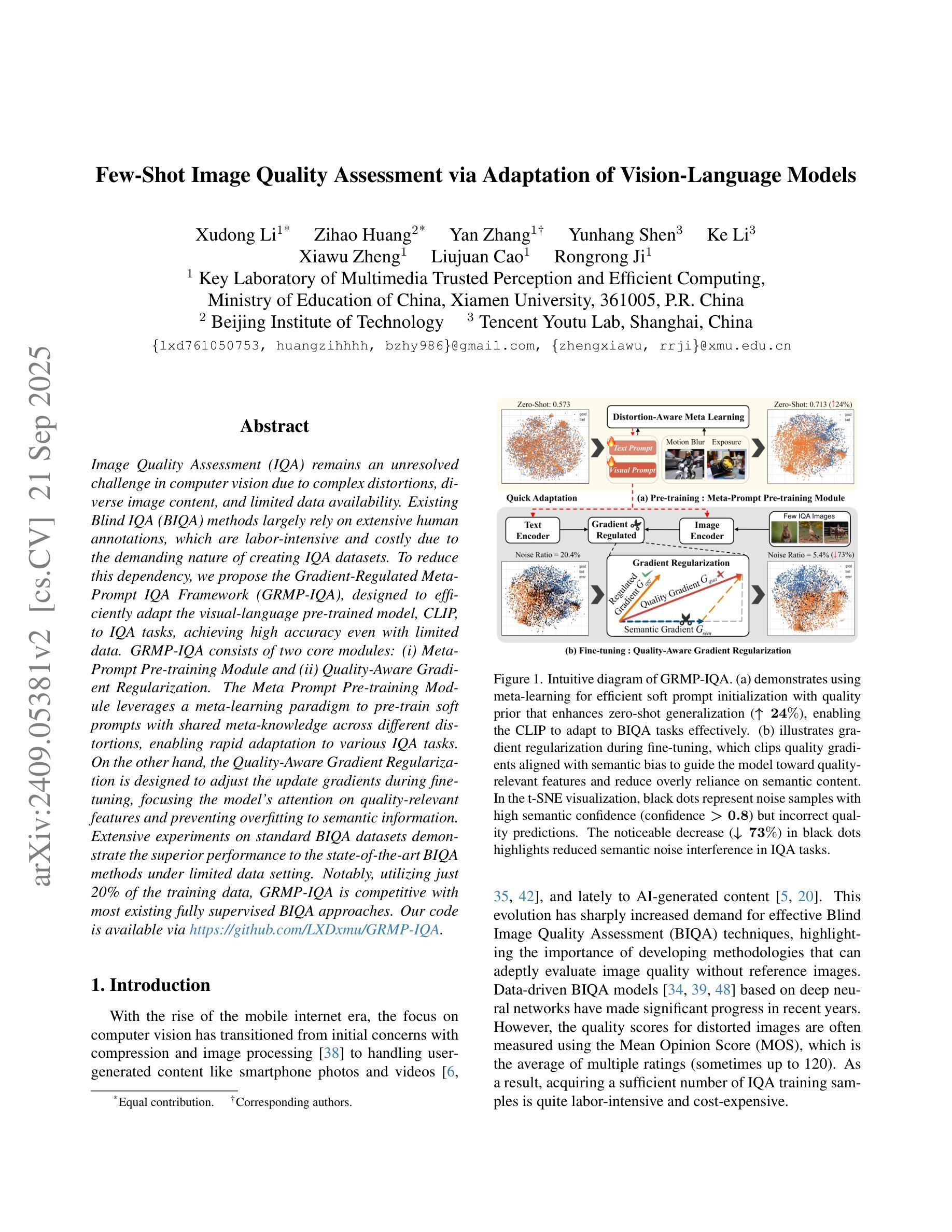 图像质量评估(IQA)仍然是计算机视觉领域的一个待解决挑战,这主要是由于复杂的失真、多样的图像内容和数据可用性有限。现有的盲图像质量评估(BIQA)方法大多依赖于广泛的人工注释,由于创建IQA数据集的性质要求严格,因此劳动密集且成本高昂。为了减少这种依赖性,我们提出了梯度调节元提示IQA框架(GRMP-IQA),旨在有效地适应视觉语言预训练模型CLIP,即使在有限数据的情况下也能实现高准确性。GRMP-IQA由两个核心模块组成:(i)元提示预训练模块和(ii)质量感知梯度正则化。元提示预训练模块利用元学习范式来预训练软提示,以获取不同失真之间的共享元知识,从而能够迅速适应各种IQA任务。另一方面,质量感知梯度正则化设计用于微调期间的更新梯度的调整,使模型专注于质量相关的特征,并防止过度拟合语义信息。在标准BIQA数据集上的广泛实验表明,在有限数据设置下,GRMP-IQA的性能优于最先进的BIQA方法。值得注意的是,仅使用20%的训练数据,GRMP-IQA与大多数现有的完全监督BIQA方法具有竞争力。