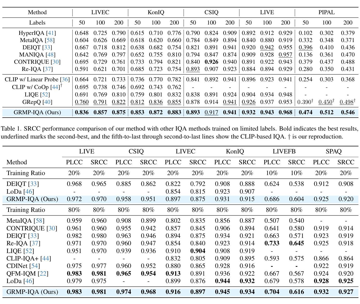 GRMP-IQA框架通过梯度调节和元提示预训练模块,使CLIP模型适应IQA任务,即使数据有限也能实现高准确率。它通过元学习范式预训练软提示,快速适应各种IQA任务。同时,质量感知梯度调节模块在微调时调整更新梯度,使模型关注质量相关特征,防止过度拟合语义信息。在标准BIQA数据集上的实验表明,在有限数据设置下,GRMP-IQA性能优于最新BIQA方法。仅使用20%的训练数据,GRMP-IQA的表现在大多数现有的完全监督BIQA方法中亦具有竞争力。