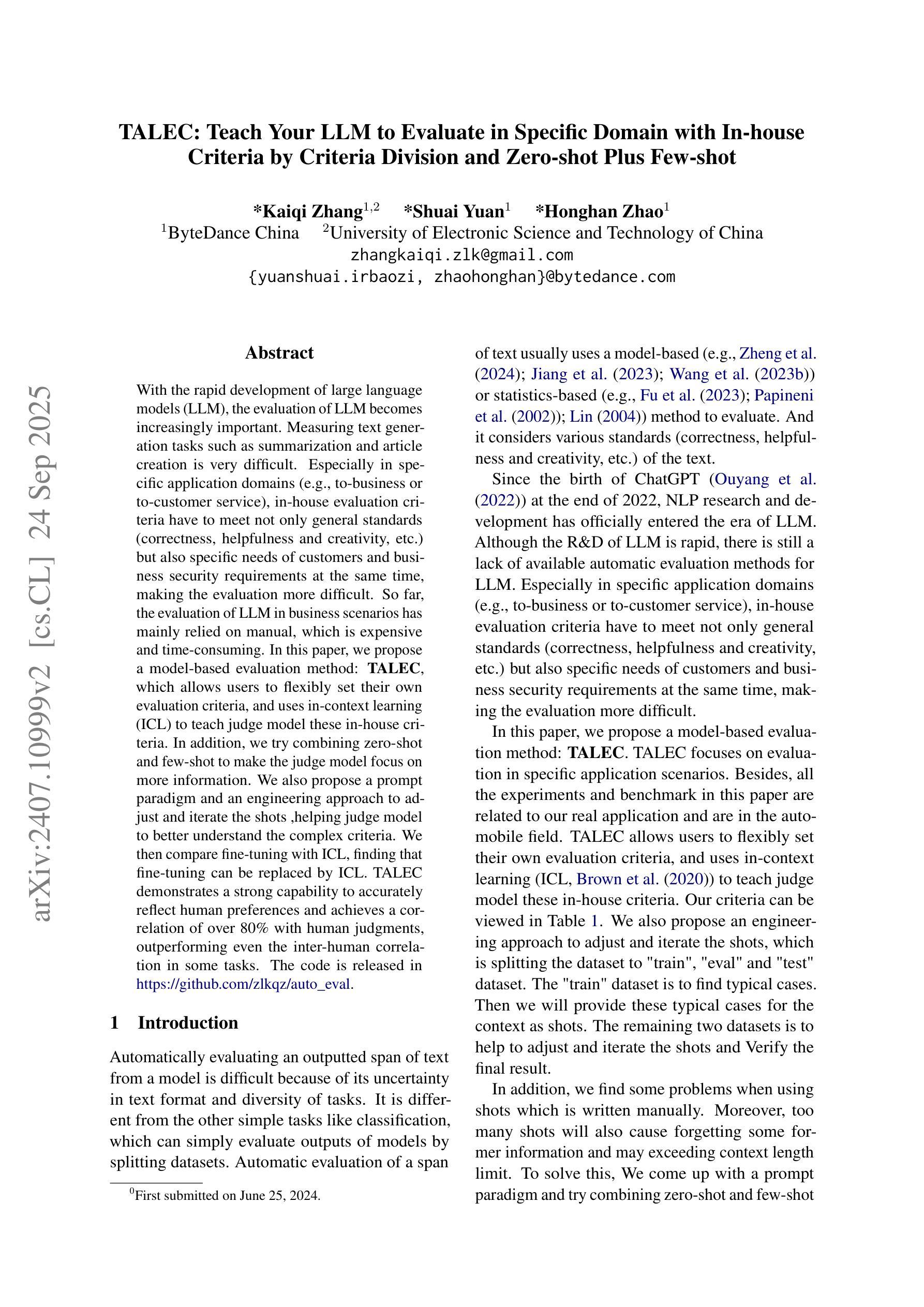 - 论文提出了一种基于模型的评估方法TALEC,允许灵活设置评估标准并运用上下文学习来教授模型这些标准。